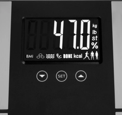 Valdymas itin paprastas: mygtukas SET ir rodyklės amžiui (18–80 m.), ūgiui (100–220 cm) ir aktyvumo lygiui 1–5 įvesti, profilio pasirinkimas moteris/vyras/sportininkas ir patogus vienetų kg/lb/st perjungimas mygtuku UNIT apatinėje dalyje. Po matavimo svarstyklės automatiškai išsijungia po 60 s, taupo bateriją ir lieka parengtos kitam naudojimui.