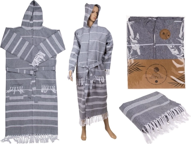 Atraskite komfortą ir eleganciją su mūsų pilku Hammam vonios chalatu, dydis L. Pagamintas iš greitai džiūstančios ir gerai sugeriančios medžiagos, jis idealiai tinka po maudynių ar apsilankymo pirtyje.