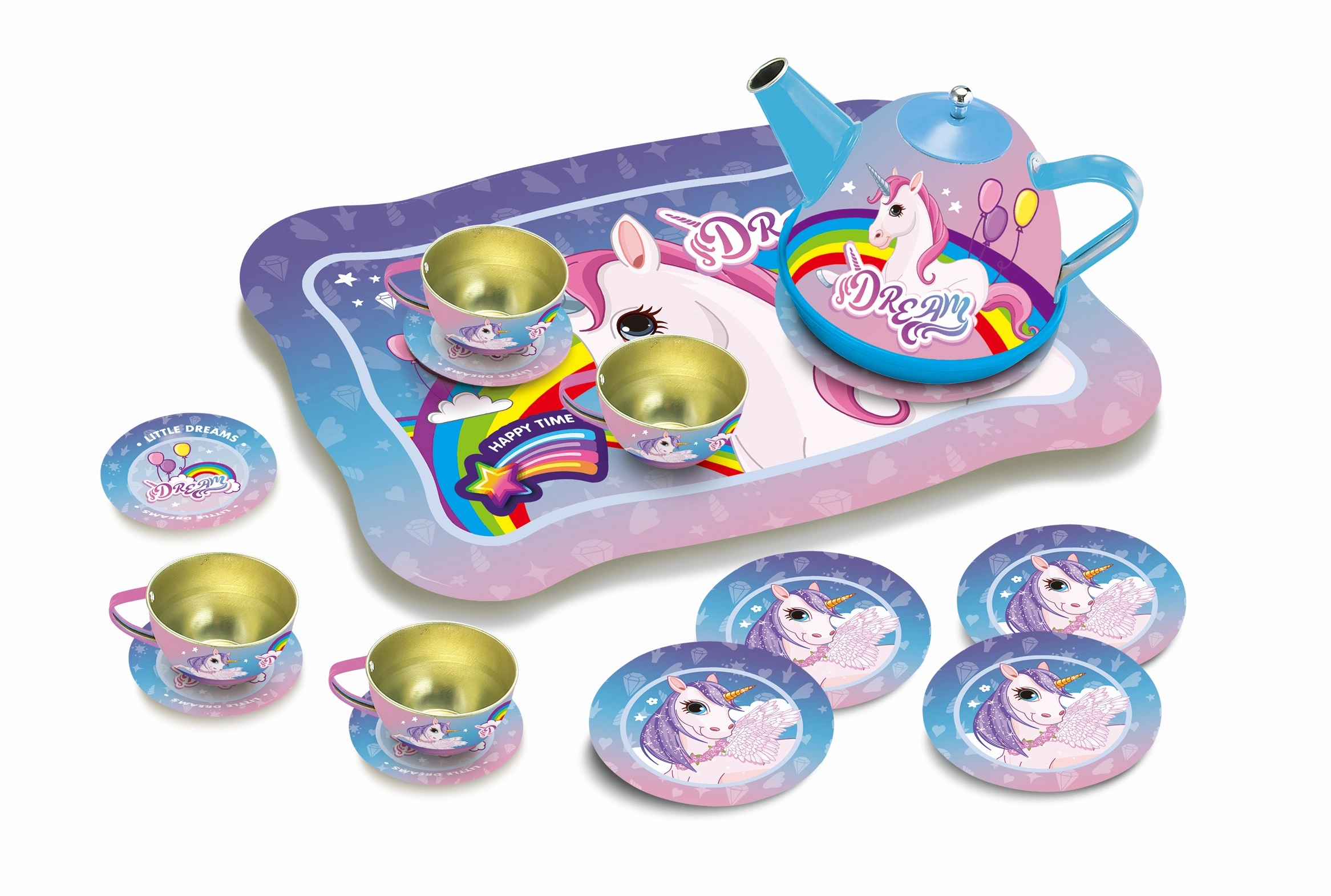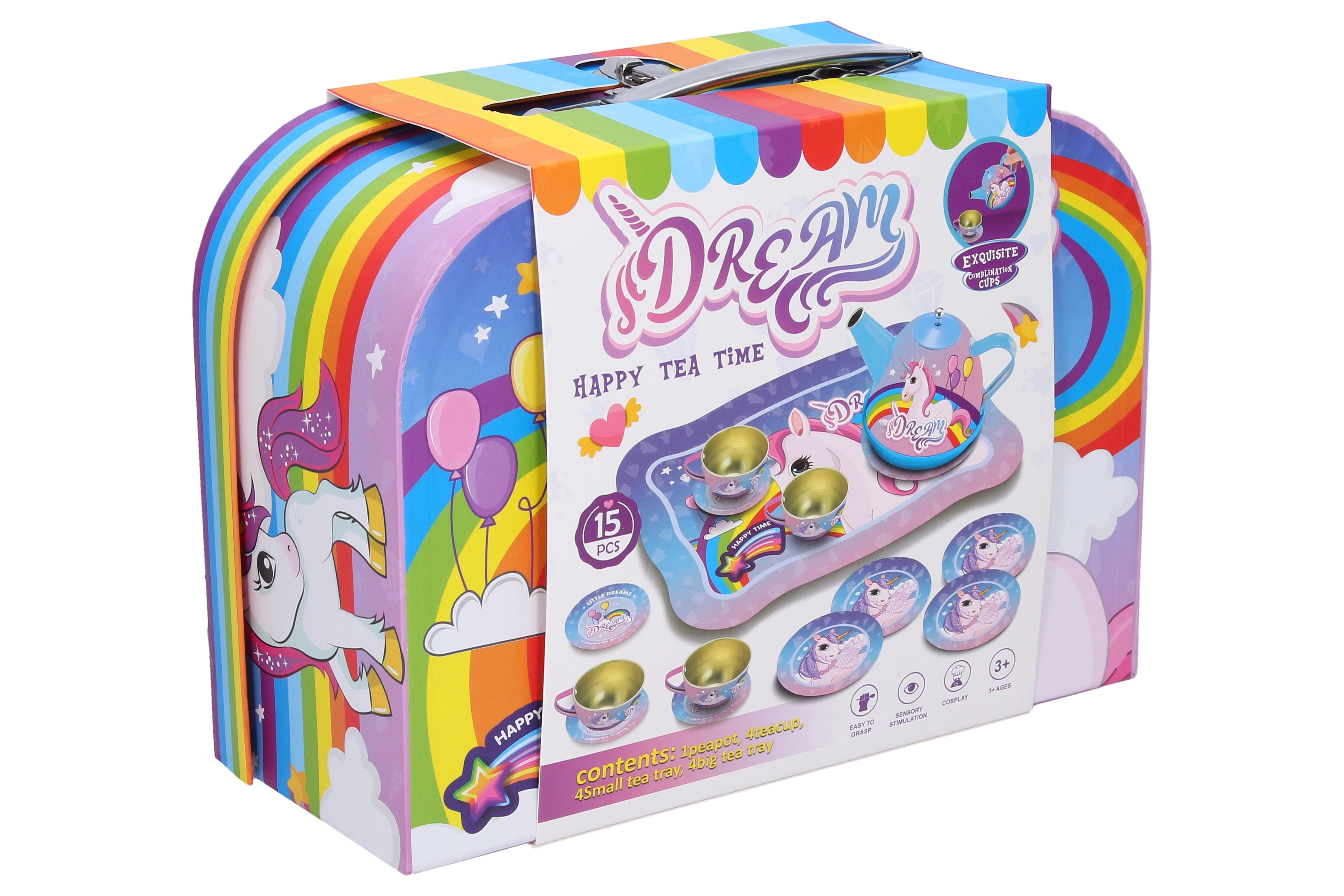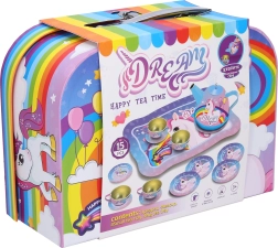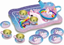 Magiškas arbatinuko rinkinys mielame lagaminėlyje su vienaragio motyvu pradžiugins kiekvieną mažąją šeimininkę. Rinkinyje yra arbatinukas, 4 puodeliai, 4 lėkštutės ir 4 lėkštės, viskas iš patvaraus metalo. Patogus lagaminėlis su rankena, matmenys 25 × 19 × 10 cm – idealu kelionėms ir laikymui.