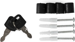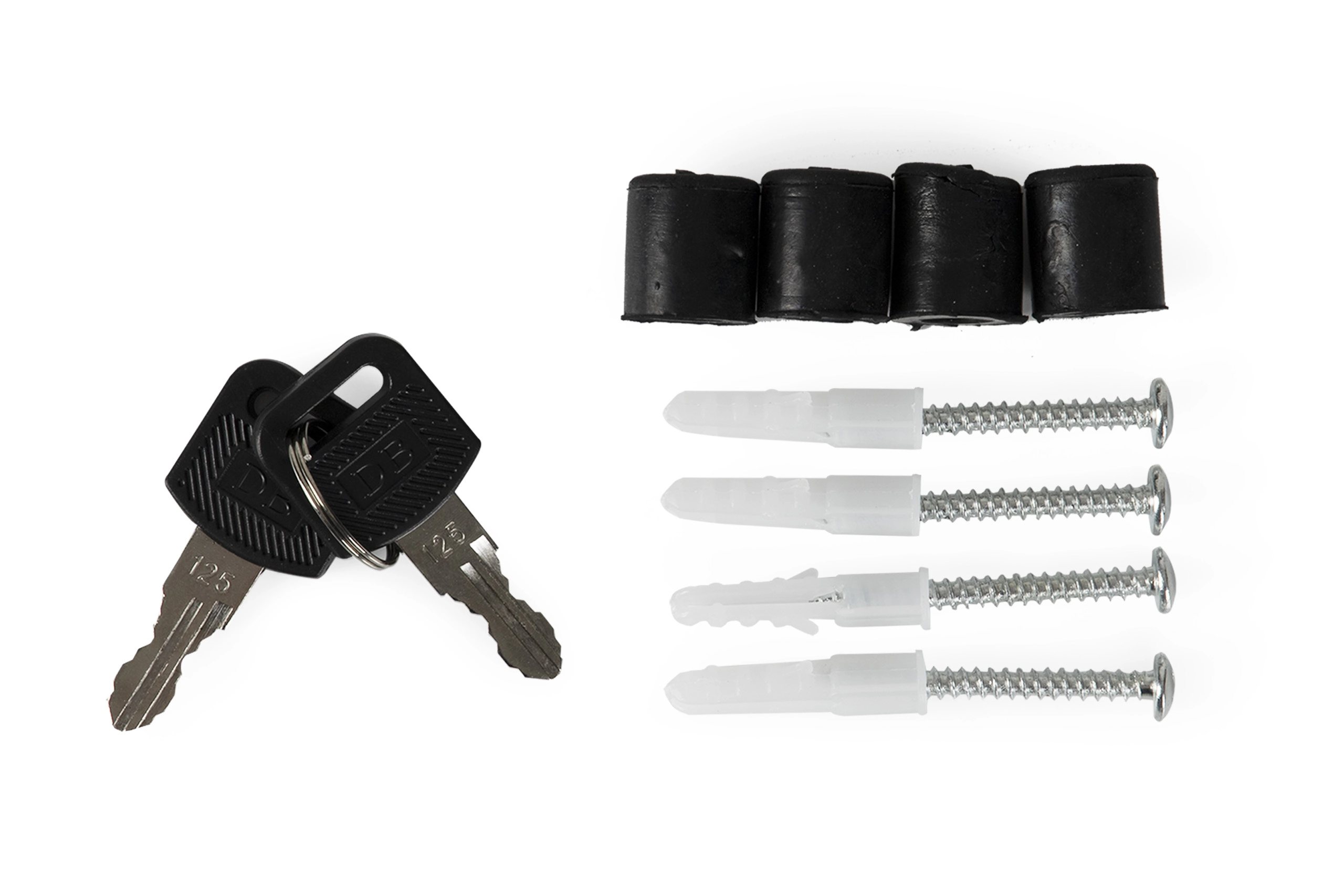 Pakuotėje yra montavimo rinkinys su keturiais kaiščiais ir tarpinėmis, todėl dėžutę galima įrengti iškart po išpakavimo. Dėžutėje yra du raktai didesniam saugumui.
