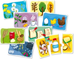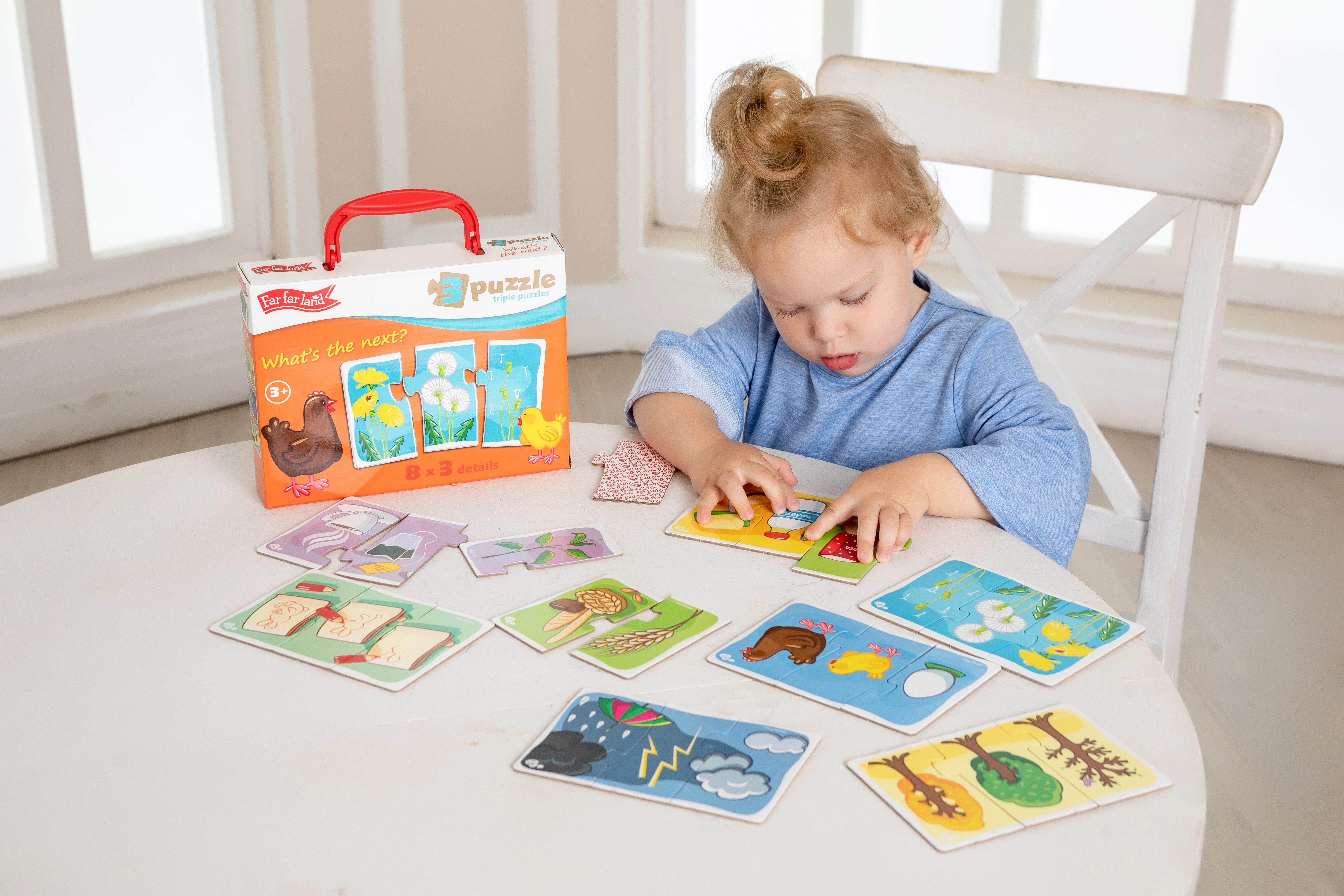Far Far Land dėlionės trijulės siūlo linksmą ir edukacinę veiklą vaikams. Kiekvienoje pakuotėje yra 8 unikalūs dėlionių paveikslėliai, sudaryti iš trijų dalių, vaizduojančių daiktus, priklausančius tai pačiai rinkiniui.