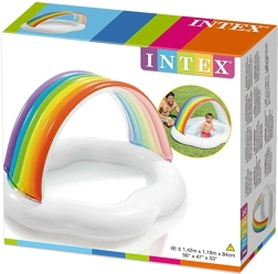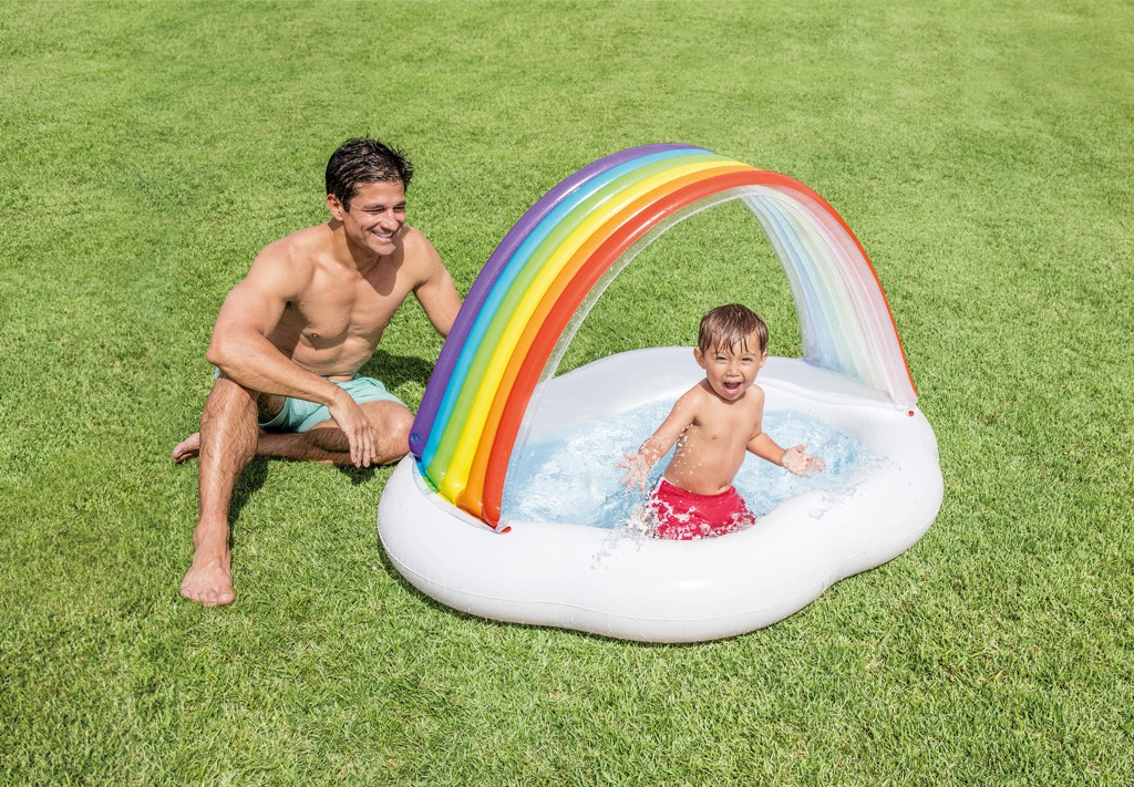 Mėgaukitės vasara su šiuo vaikišku pripučiamu baseinu Vaivorykštė, kuris suteikia malonų atgaivą tiesiai namuose. Stogelis virš baseino užtikrina pavėsį ir komfortą karštomis vasaros dienomis.