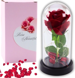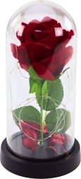 LED apšvietimas subtiliai pabrėžia rožės grožį ir kuria jaukią atmosferą, idealiai tinkančią interjero dekorui ir romantiškoms akimirkoms. Švelnūs rožės žiedlapiai, tarytum sklendžiantys kupolėje, suteikia visai kompozicijai elegancijos ir romantikos.