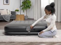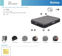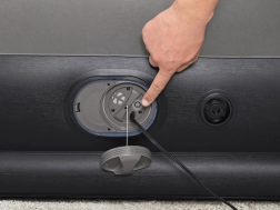 Integruotas USB siurblys pripučia lovą per 5–6 minutes ir suderinamas su AC/DC adapteriais bei išorinėmis baterijomis – idealu keliaujant. Integruota pagalvė ir malonus, rumbuotas paviršius didina miego komfortą; 152 × 203 cm dydis patogiai talpina du suaugusiuosius.