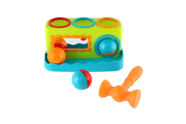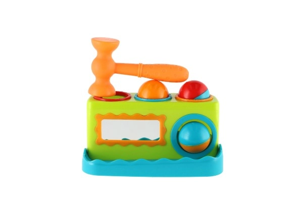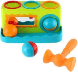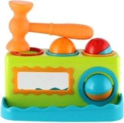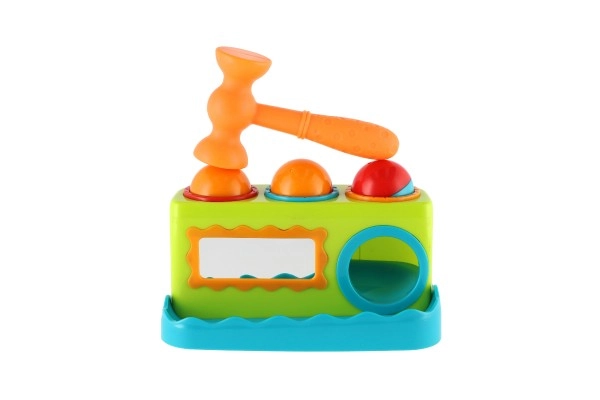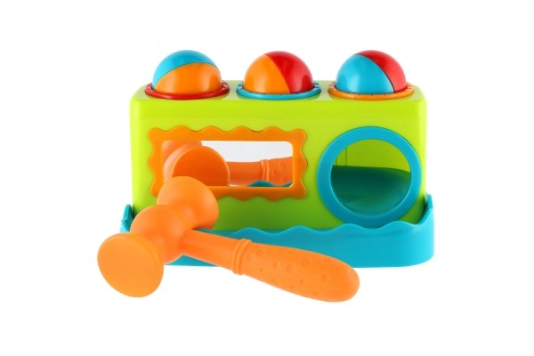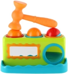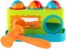 Spalvingas vazdeliojimo žaislas patiems mažiausiems lavina smulkiąją motoriką, rankos–akies koordinaciją ir natūralų smalsumą. Vaikai su lengvu plaktuku įkalinėja tris spalvingus kamuoliukus į angas ir stebi, kaip jie įkrenta. Priekinis veidrodėlis suteikia žaidybinį efektą, skatina kartoti veiksmus ir padeda formuoti savęs suvokimą. Ideali pirmoji didaktinė priemonė nuo 12 mėn.