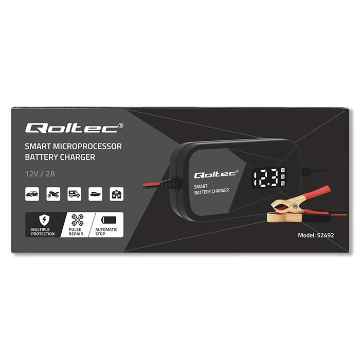 Šis išmanus 12 V, 2 A įkroviklis idealiai tinka 2–20 Ah akumuliatoriams automobiliuose, motocikluose, valtims, vejapjovėms ar keturračiams. Mikroprocesorius automatiškai pritaiko įtampą ir srovę pagal akumuliatoriaus būklę, saugo nuo perkrovimo ir po pilno įkrovimo pereina į palaikymo režimą. Didelis LED/LCD ekranas sekvenciškai rodo įtampą (V), srovę (A) ir įkrovos lygį (%) patogiam stebėjimui.
