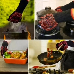 Praktiška virtuvinių pirštinių pora saugesniam kepimui ant grilio ir orkaitėje. Dėl karščiui atsparaus sluoksnio ir neslystančio silikoninio paviršiaus karštus indus laikysite tvirtai. Universalus pritaikymas prie grilio, orkaitėje ir virtuvėje, patogus dėvėjimas ir kabatėlė pakabinimui greitam laikymui.