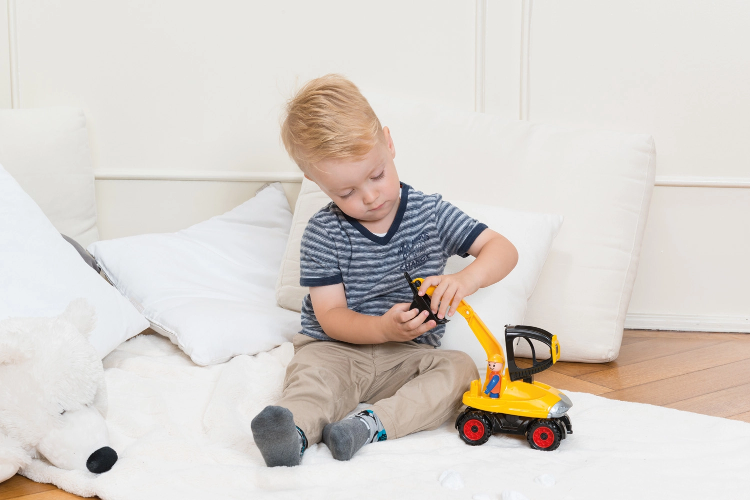 Mechaninės dalys leidžia sklandžiai judėti ekskavatoriui, skatinant vaikų kūrybiškumą žaidimo metu.