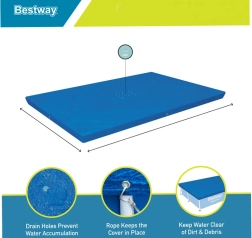Bestway uždangalas sukurtas veiksmingai apsaugoti jūsų baseiną nuo vabzdžių, lapų, paukščių ir lengvo lietaus. Dėl tvirtų tvirtinimo virvių jis atsparus vėjui, o drenažo angos neleidžia kauptis vandeniui. Uždangalas suteikia papildomą vandens šiluminę izoliaciją baseine.
