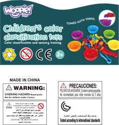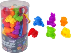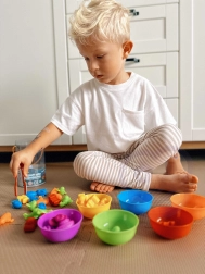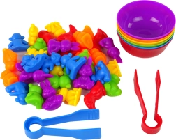 Šis spalvingas montesorio rinkinys suteikia paprastą, bet labai veiksmingą mokymosi formą. Vaikai išberia figūrėles ant stalo ir su žnyplutėmis priskiria jas lėkštelėms pagal spalvą, taip lavindami akių–rankų koordinaciją, sutelktumą ir loginį mąstymą. Guminės figūrėlės yra malonios liesti ir saugios mažoms vaikų rankoms.