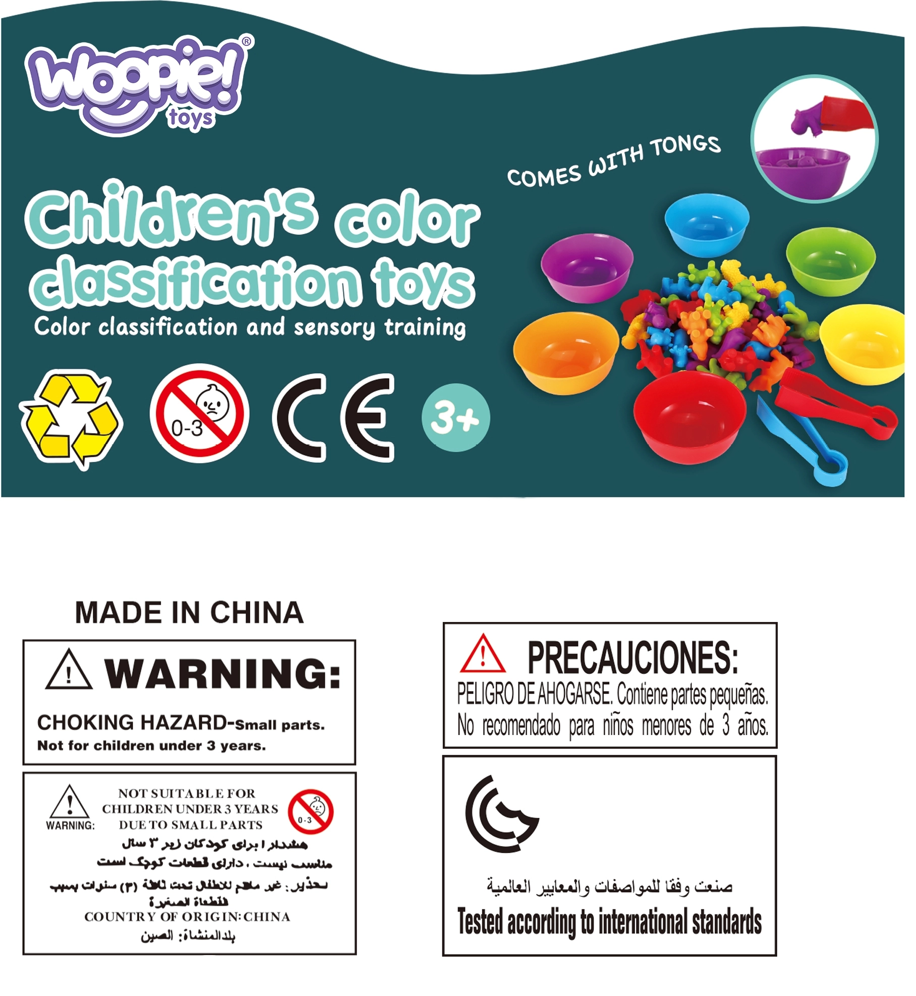 Mokomasis žaidimas WOOPIE montesorio spalvų rūšiuoklis su gyvūnėliais siūlo mokymąsi per žaidimą – vaikai naudodami šepetėlius/žnyplutes rūšiuoja gumines figūrėles į spalvotas lėkšteles, lavina spalvų pažinimą, skaičiavimą ir smulkiąją motoriką. Idealu 1–2 vaikams nuo 3 metų.