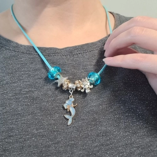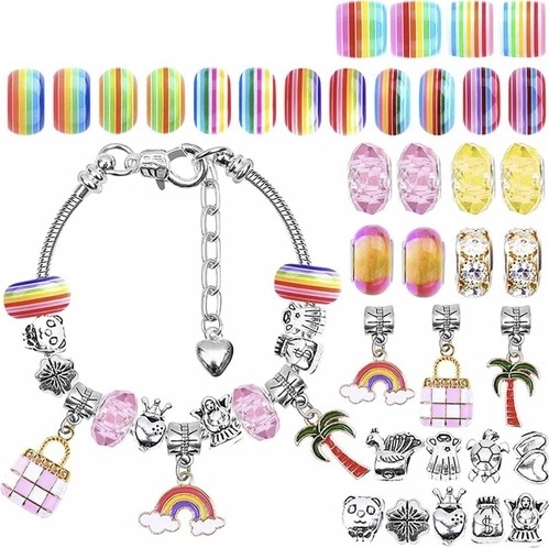 Kūrybinis rinkinys papuošalams ir apyrankėms gaminti vaikams siūlo daugybę spalvotų karoliukų ir įvairių formų pakabukų, leidžiančių kurti gražias apyrankes ir vėrinius.
