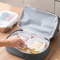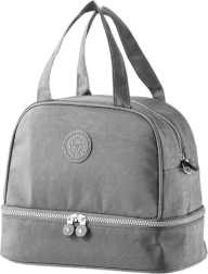 Pagrindinis apatinis skyrius pasižymi didele talpa ir lengvai sutalpina pietų dėžutes, vaisius, gėrimus, termobutelius ar puodelius. Viršutinė kišenė skirta mažesniems daiktams, tokiems kaip batonėliai, jogurtai, servetėlės ar stalo įrankiai, todėl turinys lieka tvarkingas ir lengvai pasiekiamas. Reguliuojamas peties dirželis leidžia patogiai nešioti rankinę ir prireikus jį lengvai atsegti.