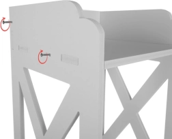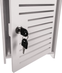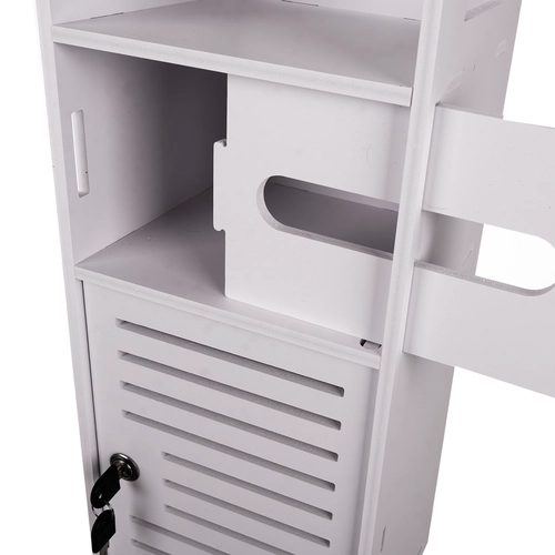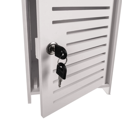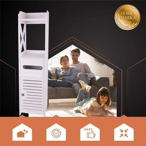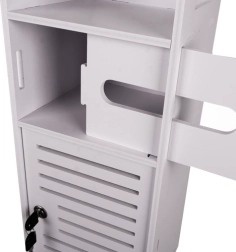 Balta pastatoma vonios spintelė yra praktiškas sprendimas kosmetikai ir valymo priemonėms laikyti. Dėl užrakto raktu ji saugo turinį nuo vaikų ir pasižymi estetišku dizainu, tinkančiu bet kuriai voniai.