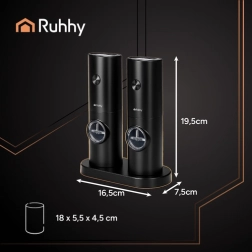 Elektriniai pipirų ir druskos malūnėliai RUHHY – idealus pasirinkimas vertinantiems kokybę ir estetiką. Universalus naudojimas leidžia malūnėlius naudoti įvairių tipų prieskoniams, įskaitant žoleles. Malimą užtikrina keraminis mechanizmas, kuris yra ilgaamžis ir tikslus, be metalo poskonio.