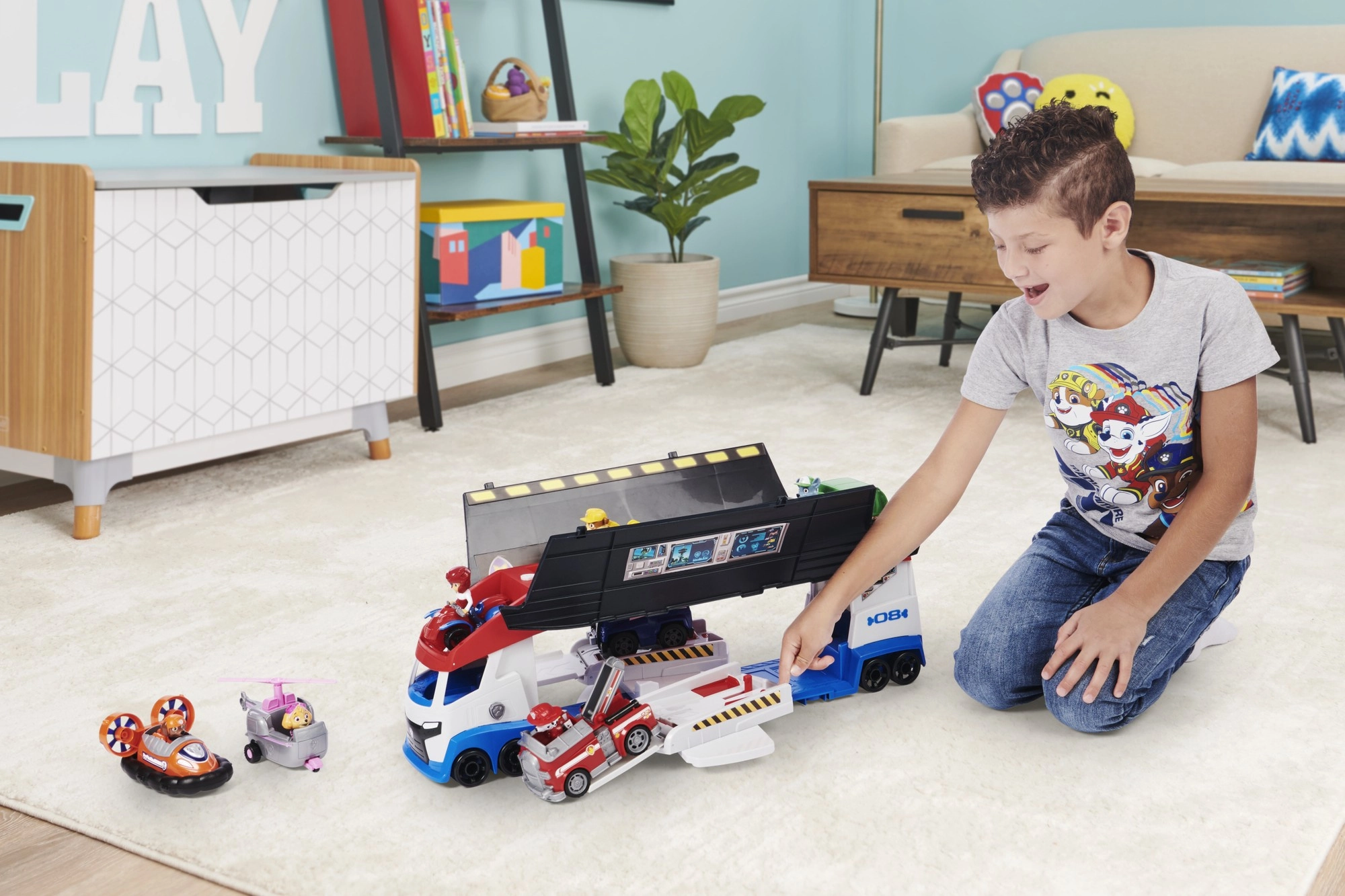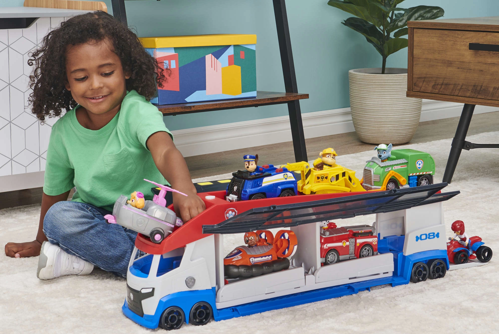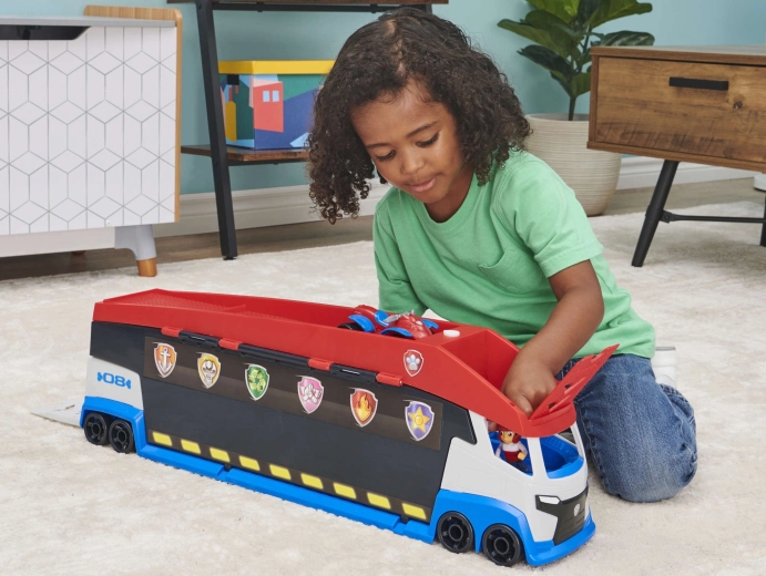 Milžiniškas transporteris, įkvėptas populiaraus PAW PATROL serialo, pradžiugins visus mažus gelbėtojus. Dėka atverčiamų šoninių panelių ir rampų vilkikas virsta mobiliąja servisų ir vadavietės stotimi. Paspaudus mygtuką su letenėlės logotipu, pasigirsta realistiški variklio, garso signalo ir važiavimo atbulomis garsai, dar labiau sustiprinantys žaidimo atmosferą.