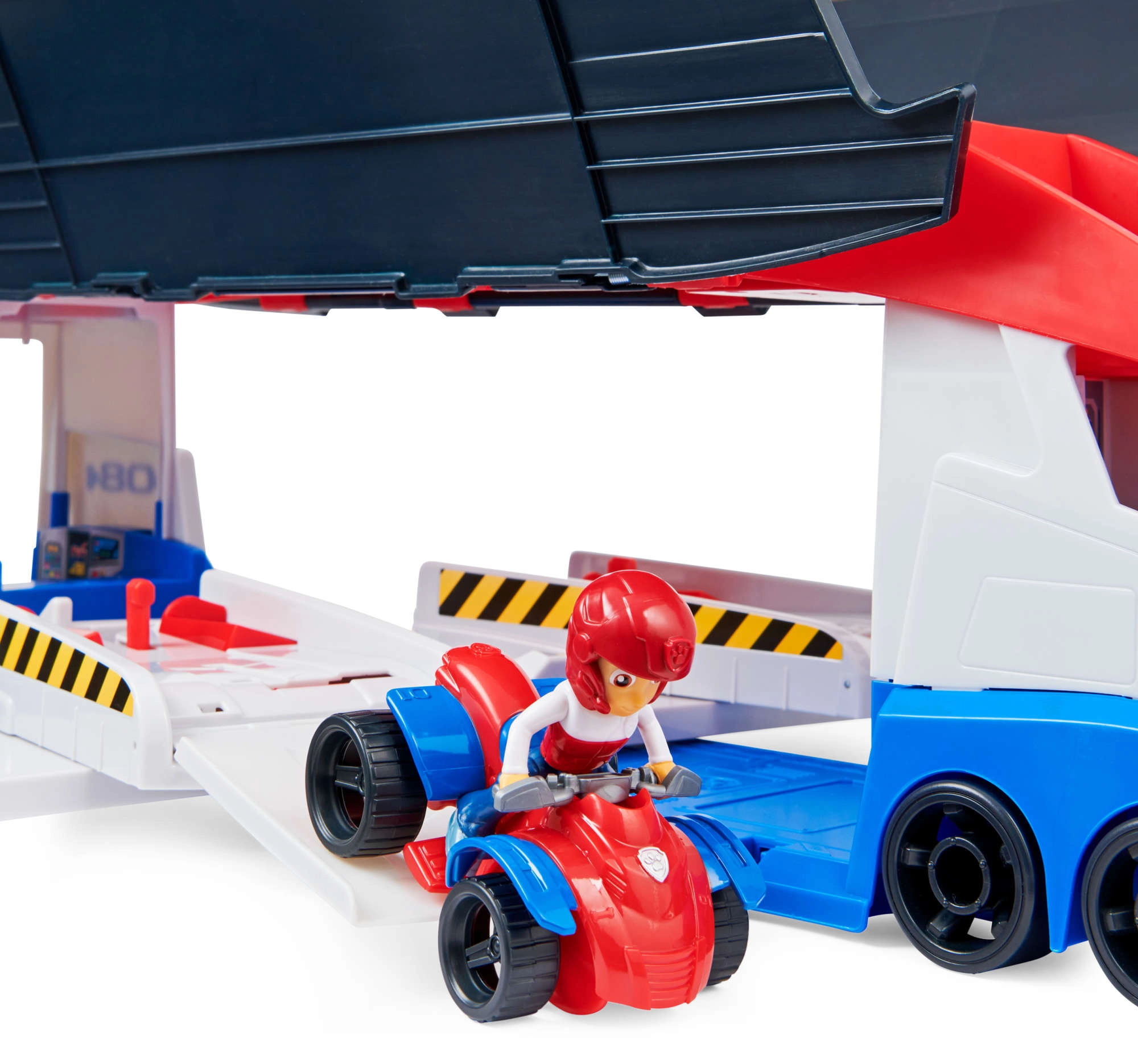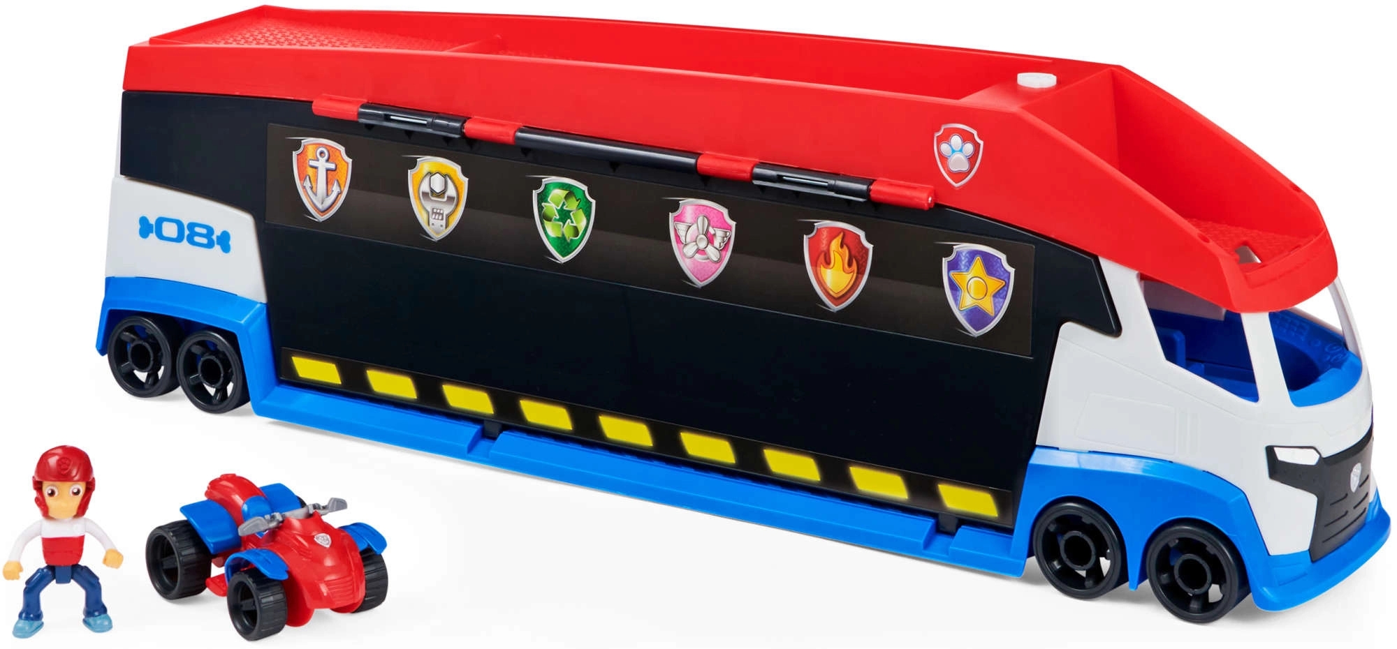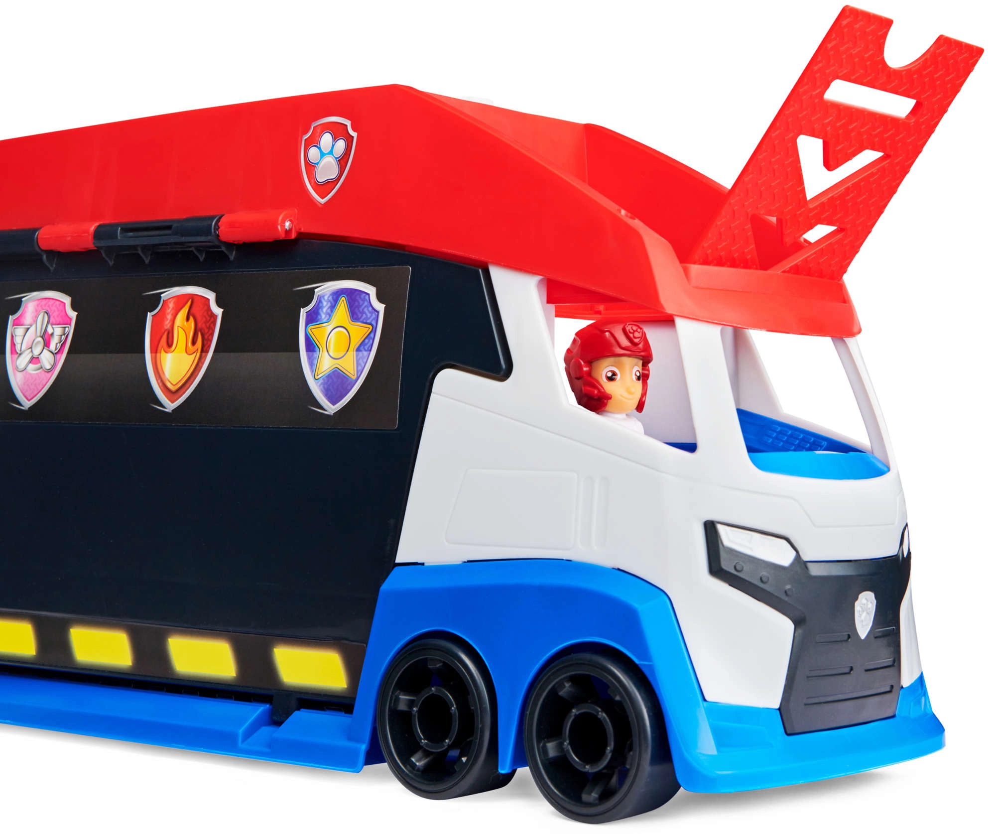 Patrulių sunkvežimis lengvai perveža iki 6 transporto priemonių (suderinamas su standartiniais PAW PATROL automobiliais), turi 2 paleidiklius greitam startui į veiksmą ir pakeliamas šonines duris sklandžiam užvažiavimui. Su pridėta Ryderio figūrėle ir jo keturračiu vaikai gali iškart leistis į misiją.