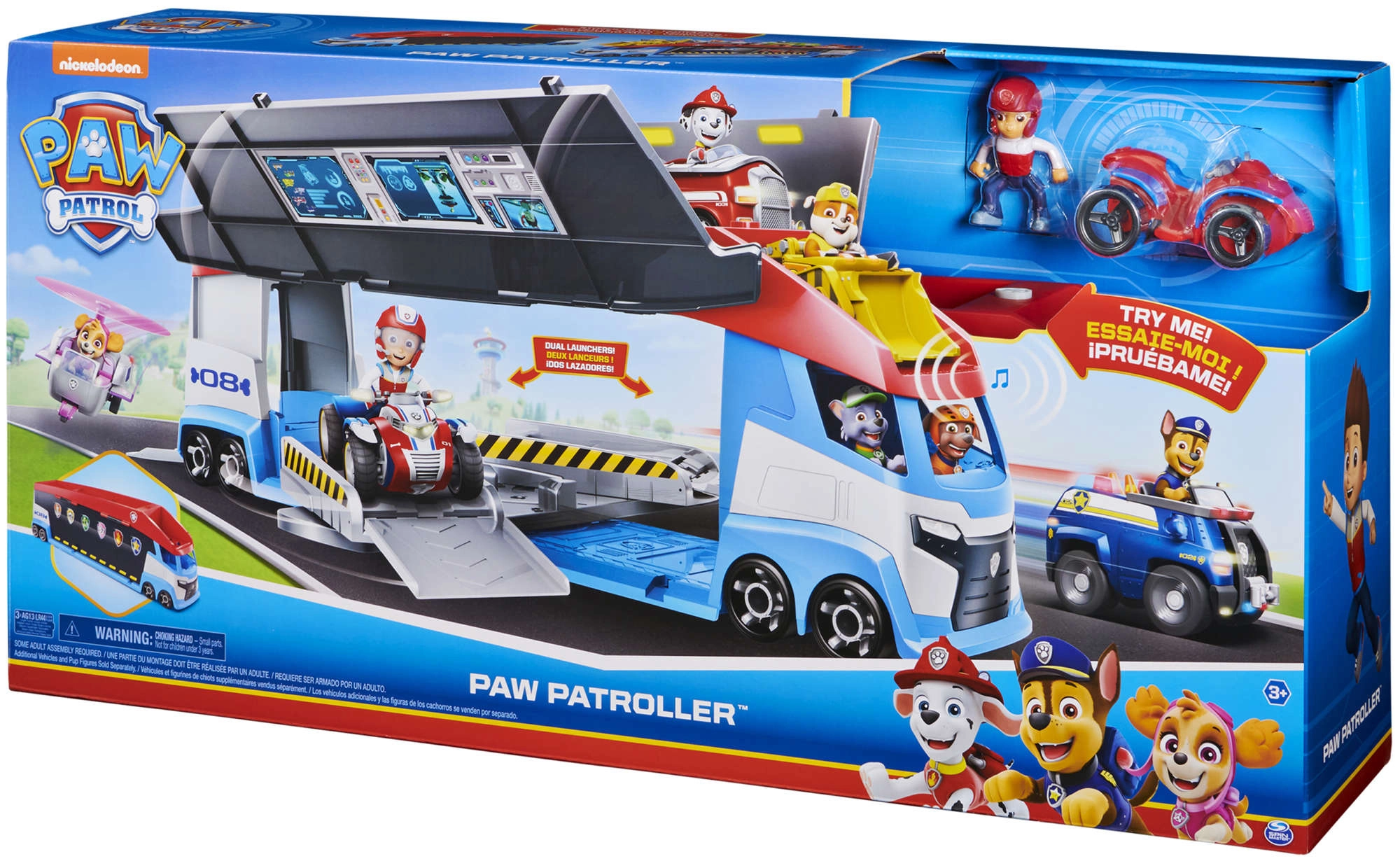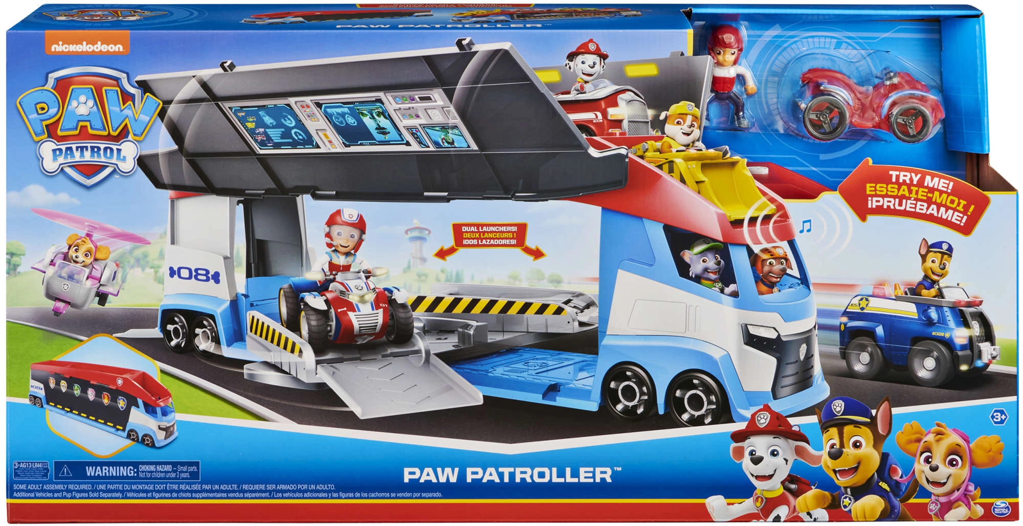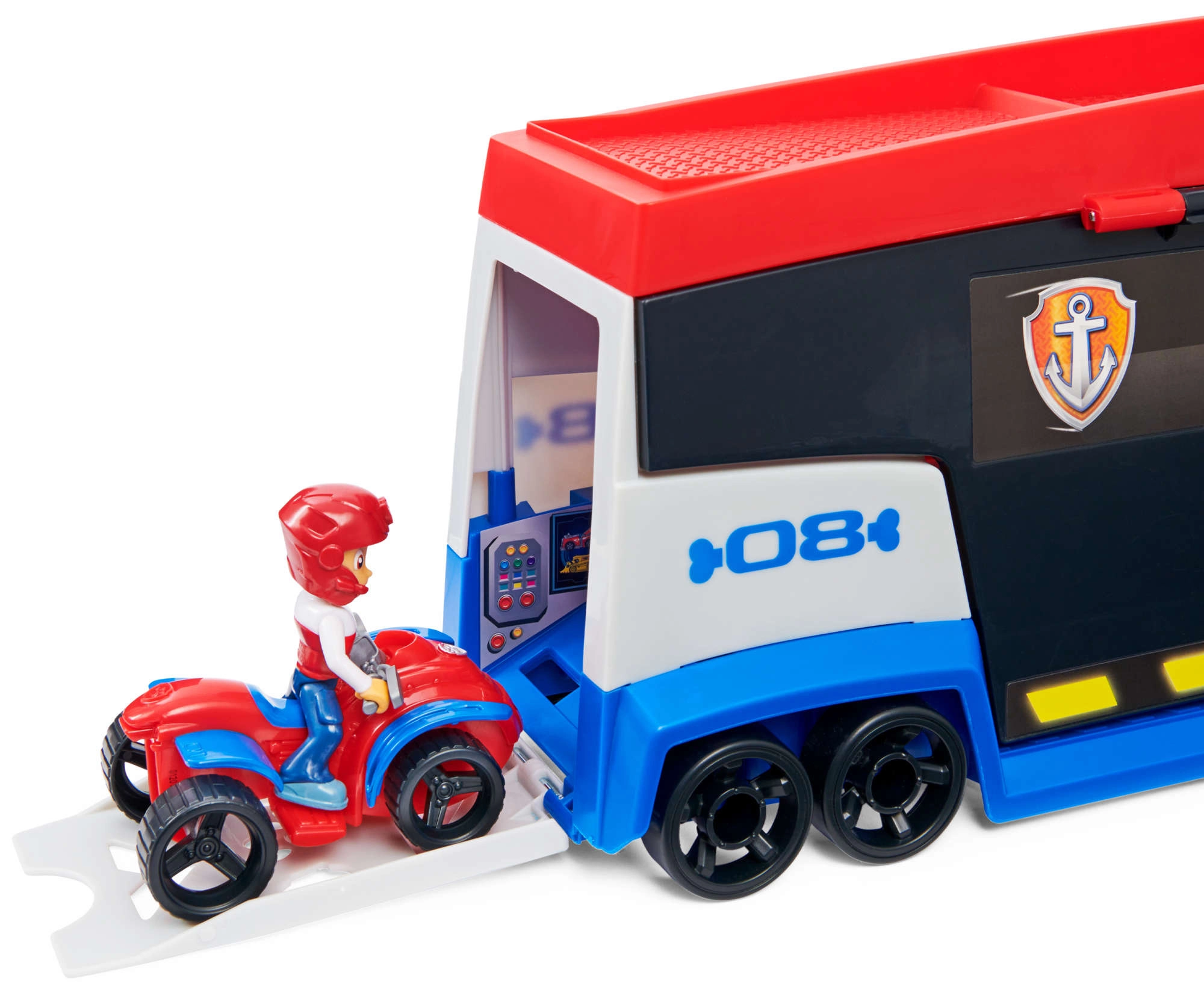 Patrulių sunkvežimis lengvai perveža iki 6 transporto priemonių (suderinamas su standartiniais PAW PATROL automobiliais), turi 2 paleidiklius greitam startui į veiksmą ir pakeliamas šonines duris sklandžiam užvažiavimui. Su pridėta Ryderio figūrėle ir jo keturračiu vaikai gali iškart leistis į misiją.