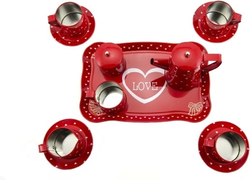 Gražus raudonas skardinis arbatos servizas su širdelių motyvu, idealiai tinka visoms mažosioms virėjoms, norinčioms pagražinti savo virtuvėlę.