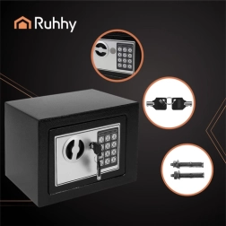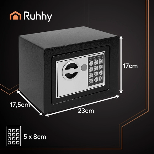 Kompaktiškas RUHHY seifas saugo jūsų vertybes dėl elektroninės kodinės spynos, automatinio užsiblokavimo po 3 neteisingų bandymų ir avarinių atidarymo raktų. Idealiai tinka namams, biurui ir viešbučiui, pagamintas iš patvaraus plieno, su šviesos ir garso signalizacija bei galimybe montuoti ant sienos.