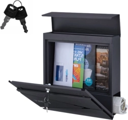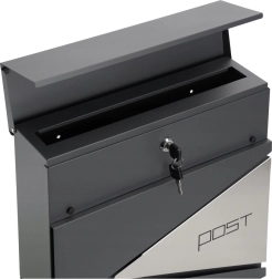 Stilinga antracito spalvos pašto dėžutė dera moderni išvaizda ir praktiškos detalės. Pagaminta iš kokybiško cinkuoto plieno su milteline danga, todėl yra atspari korozijai, orų poveikiui ir mechaniniams pažeidimams. Talpina A4 formatą, turi platų 3,5 cm įmetimą ir atskirą laikraščių laikiklį apačioje. Saugų uždarymą užtikrina spyna su dviem raktais.