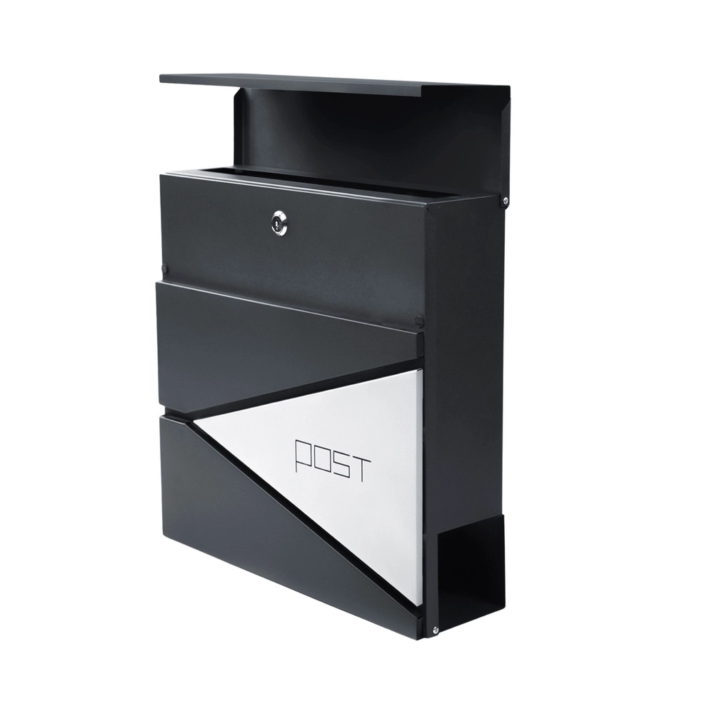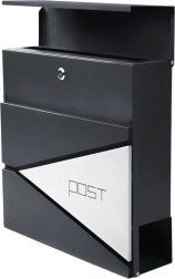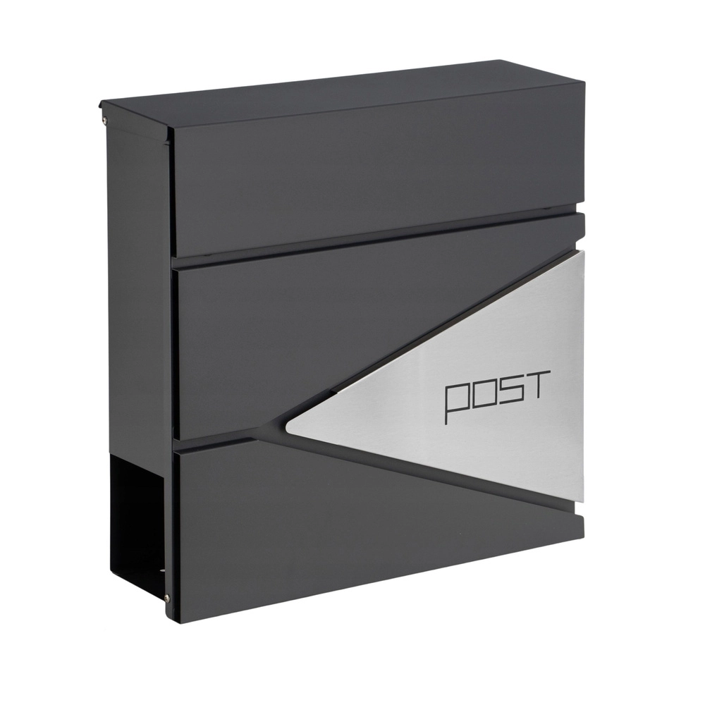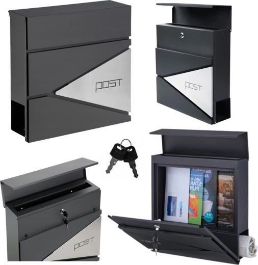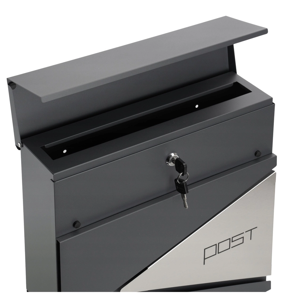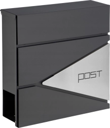 Ši antracito spalvos laiškų dėžutė pasižymi švariu dizainu, kurį papildo geometriniai išpjovimai ir minimalistinis užrašas „POST“. Dėl patvarių medžiagų ir miltelinio dažymo ji idealiai tinka ilgalaikiam naudojimui lauke.