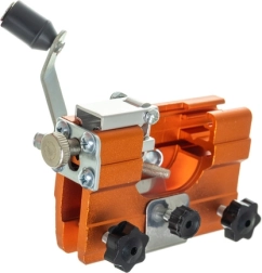 Montuojamas tiesiai ant pjovimo juostos – nenuimant grandinės. Tvirtas prispaudimas ir ergonomiška rankenėlė sumažina vibracijas ir slydimo riziką. Patvari konstrukcija iš anodizuoto aliuminio su plieninėmis tvirtinimo detalėmis parengta intensyviam naudojimui tiek dirbtuvėse, tiek miške.