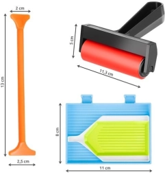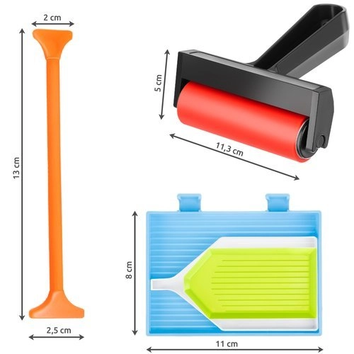 Pakuotėje rasite 4 aplikatorius („rašiklius“), 3 briaunuotas lėkštutes deimantų rūšiavimui ir paėmimui, pincetą, klijus, pernešimo krepšį ir volelį. Rinkinys tinka tiek pradedantiesiems, tiek pažengusiems ir puikiai dera bendrai kūrybai su vaikais bei draugais.