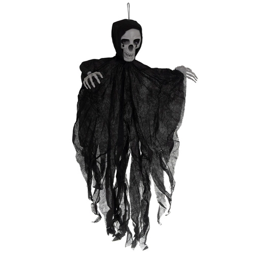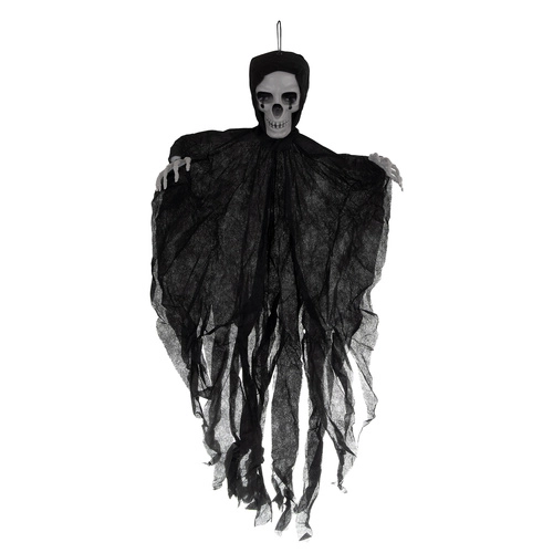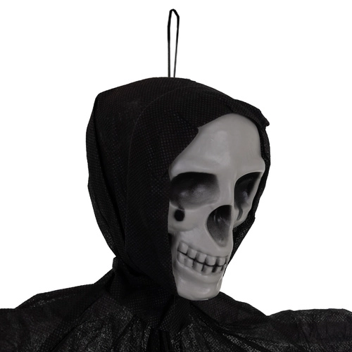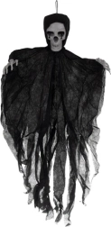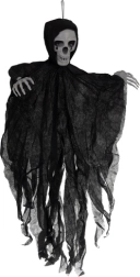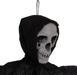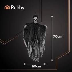Realistiškas pakabinamas skeletas su suplėšytu audiniu akimirksniu sukuria siaubo atmosferą. Lengva konstrukcija ir kilpelė paprastam pakabinimui leidžia pritvirtinti prie lubų, durų, šviestuvo ar po stogeliu lauke. Vėjyje besiplaikantis audinys kuria sklandančios šmėklos efektą, o 70 cm dydis paverčia ją ryškiu dekoracijos akcentu. Idealu Helovinui, teminiams vakarėliams ir scenografijai.