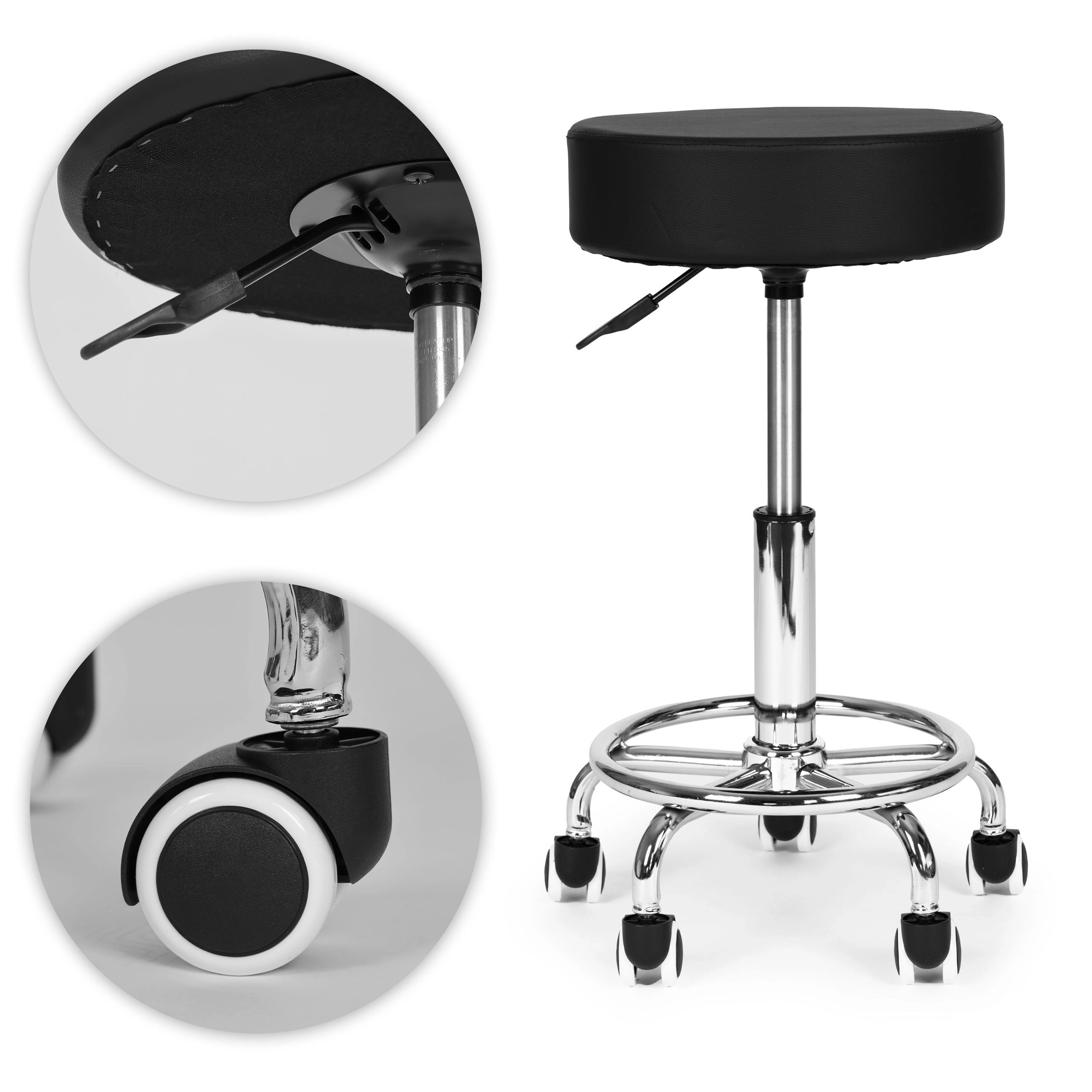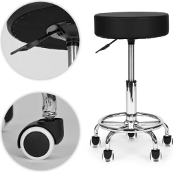 Atspari konstrukcija ir lengva priežiūra – PVC odos apmušalai yra lengvai valomi, atsparūs vandeniui, masažo aliejams ir dezinfekantams. Metalinė (chromuota) konstrukcija su plačia penkių stipinų baze su ratukais užtikrina stabilumą ir tolygų judėjimą dauguma grindų nebraižant paviršiaus.