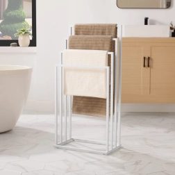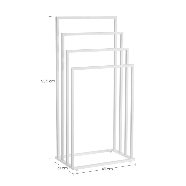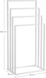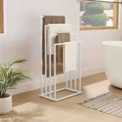 Elegantiškas laisvai stovintis rankšluosčių stovas su keturiomis svirtimis matinės baltos spalvos padės palaikyti tvarką jūsų vonios kambaryje ar skalbykloje. Dėl tvirtos plieninės konstrukcijos ir pakopomis išdėstytų skersinių užtikrinamas greitas vėdinimas ir lengvas rankšluosčių džiovinimas, taip pat maudymosi kostiumėlių ir smulkių skalbinių. Stabilus, patvarus ir estetiškas akcentas šiuolaikiniam interjerui.