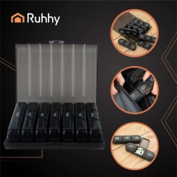 Laikykite savo vaistus ir papildus idealiai sutvarkytus. RUHHY organizatorius turi septynias atskiras dienines dėžutes, kiekvieną su trimis kameromis ryto, dienos ir vakaro dozėms. Aiškūs žymėjimai ir spragtelėjimu užsidarantys dangteliai mažina klaidų riziką ir užtikrina, kad dozės visada būtų po ranka.