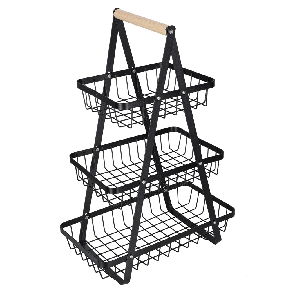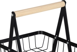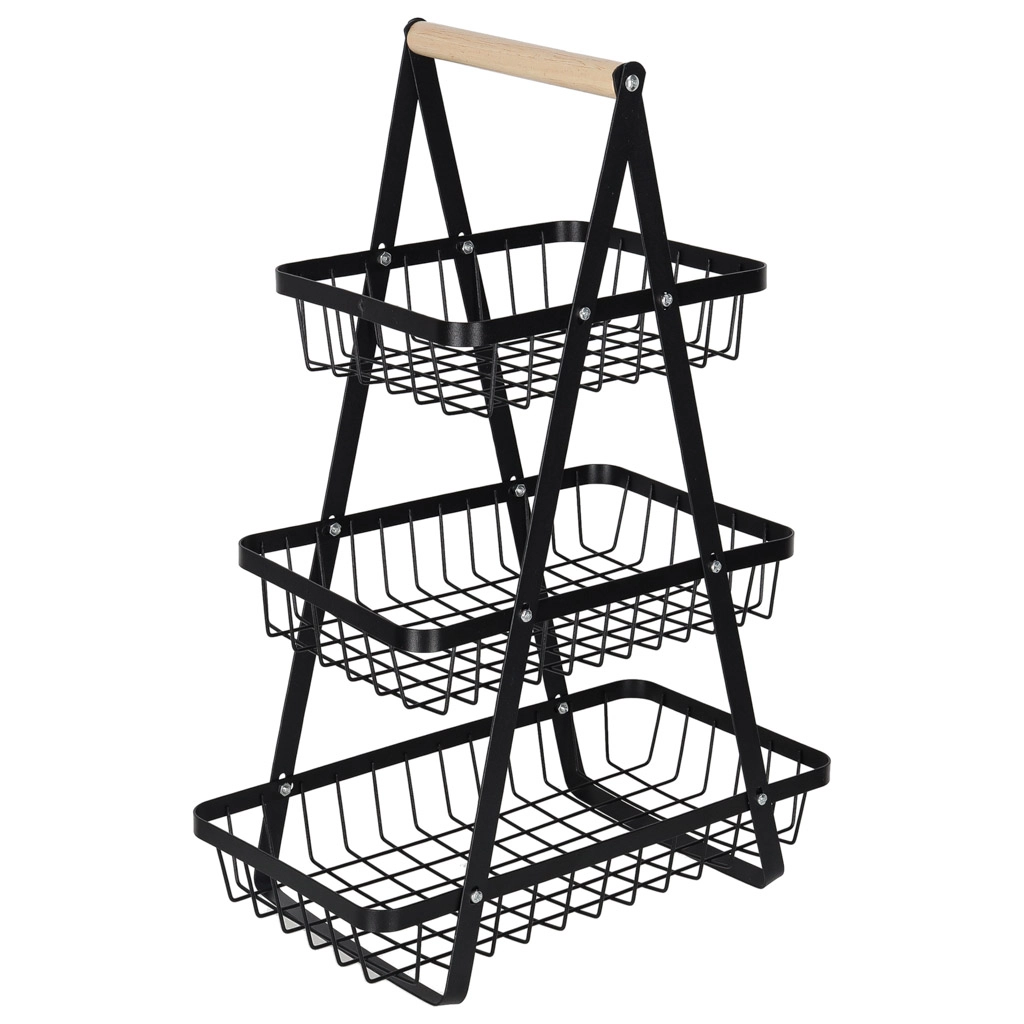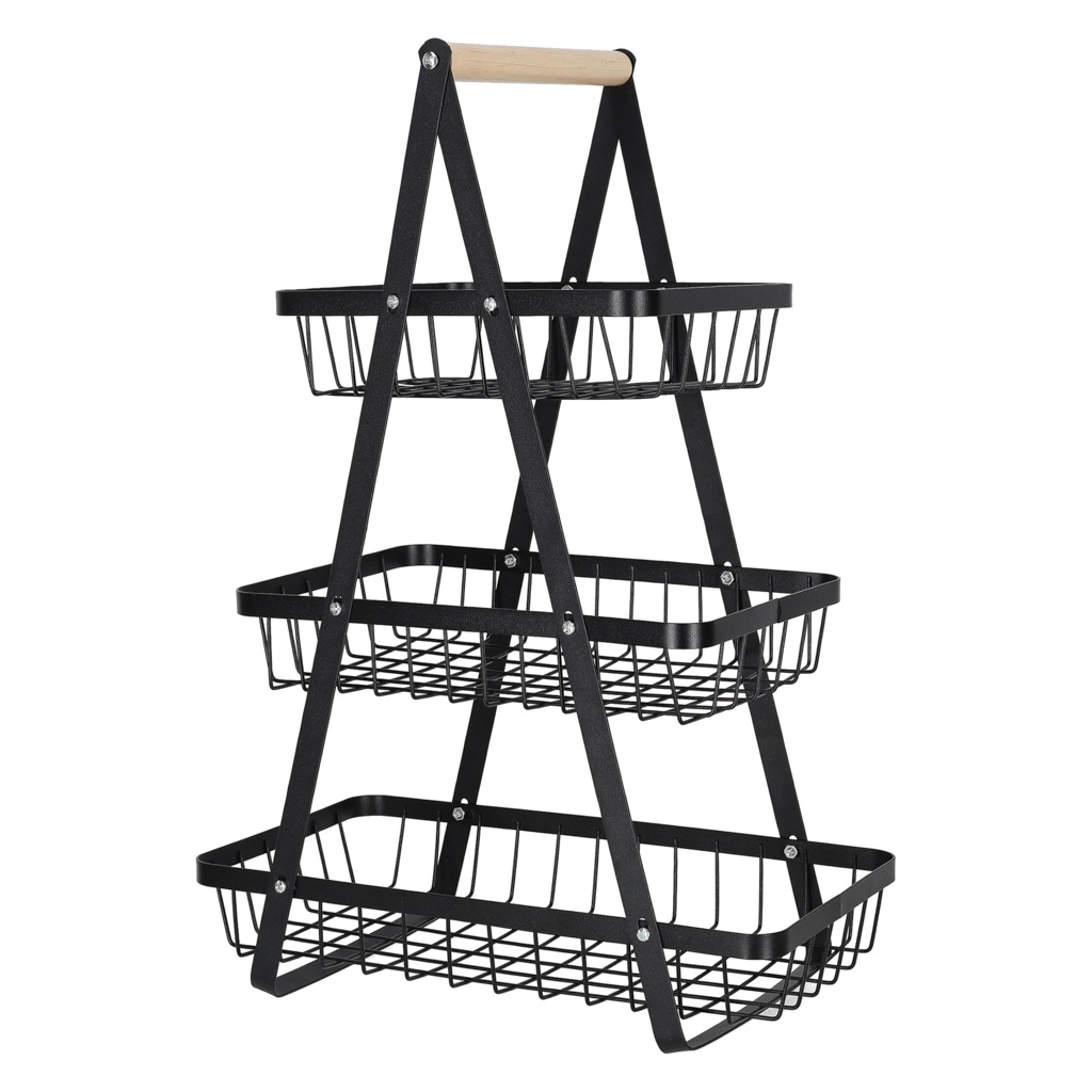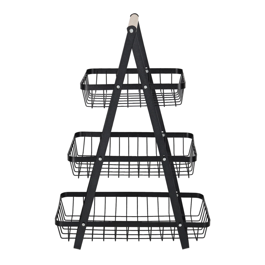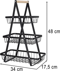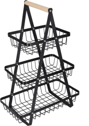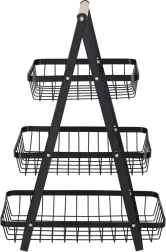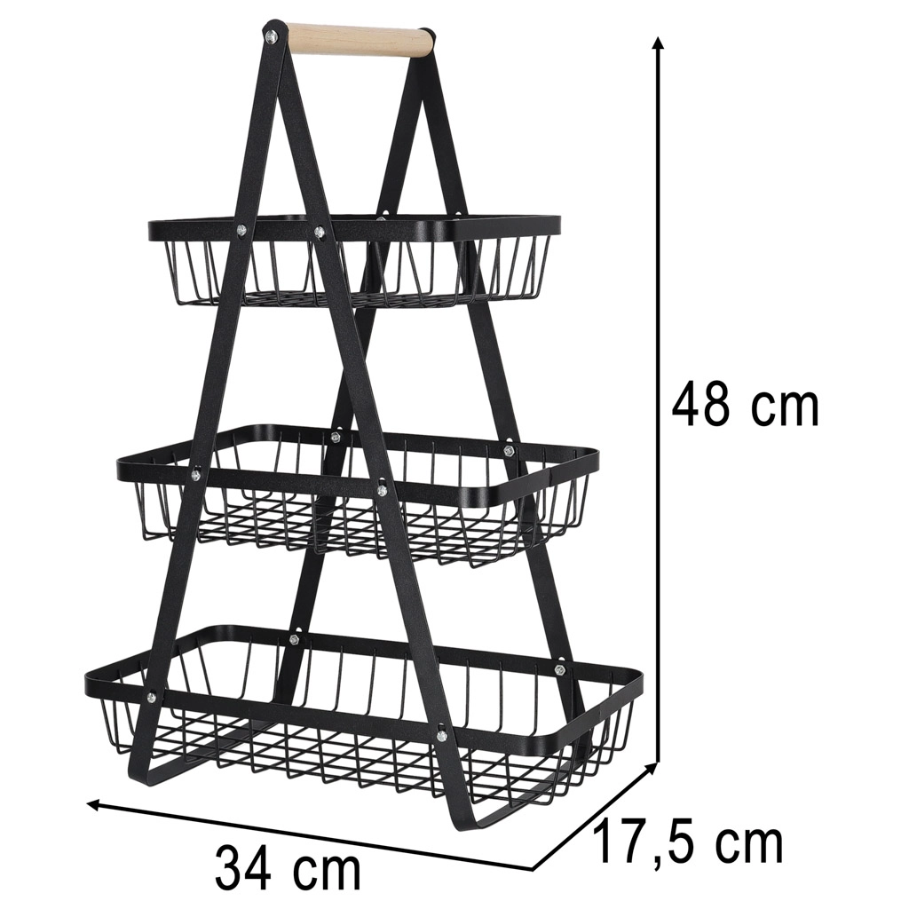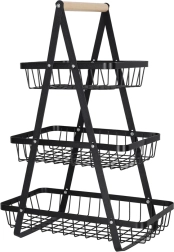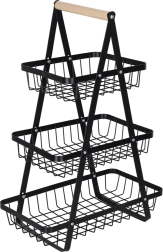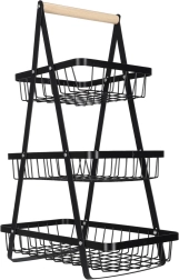 Susitvarkykite virtuvę, sandėliuką ar valgomojo erdvę su elegantišku trijų aukštų stovu. Tvirta matinės juodos spalvos metalinė konstrukcija ir patogi medinė rankena užtikrina stabilumą, patvarumą ir lengvą pernešimą. Dėl laipsniško išdėstymo turinys visada matomas ir po ranka.
