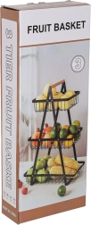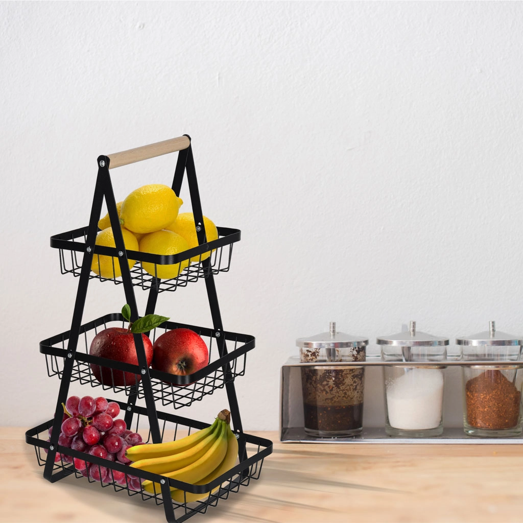 Stilingas trijų aukštų vaisių krepšys iš patvaraus metalo su medine rankena taupo vietą ant stalviršio ir palaiko virtuvėje tvarką. Trys erdvūs krepšeliai su atvira vieline konstrukcija užtikrina oro cirkuliaciją, kad vaisiai ir daržovės ilgiau išliktų švieži. Taip pat idealu duonos gaminiams, užkandžiams ar vonios kambario reikmenims.
