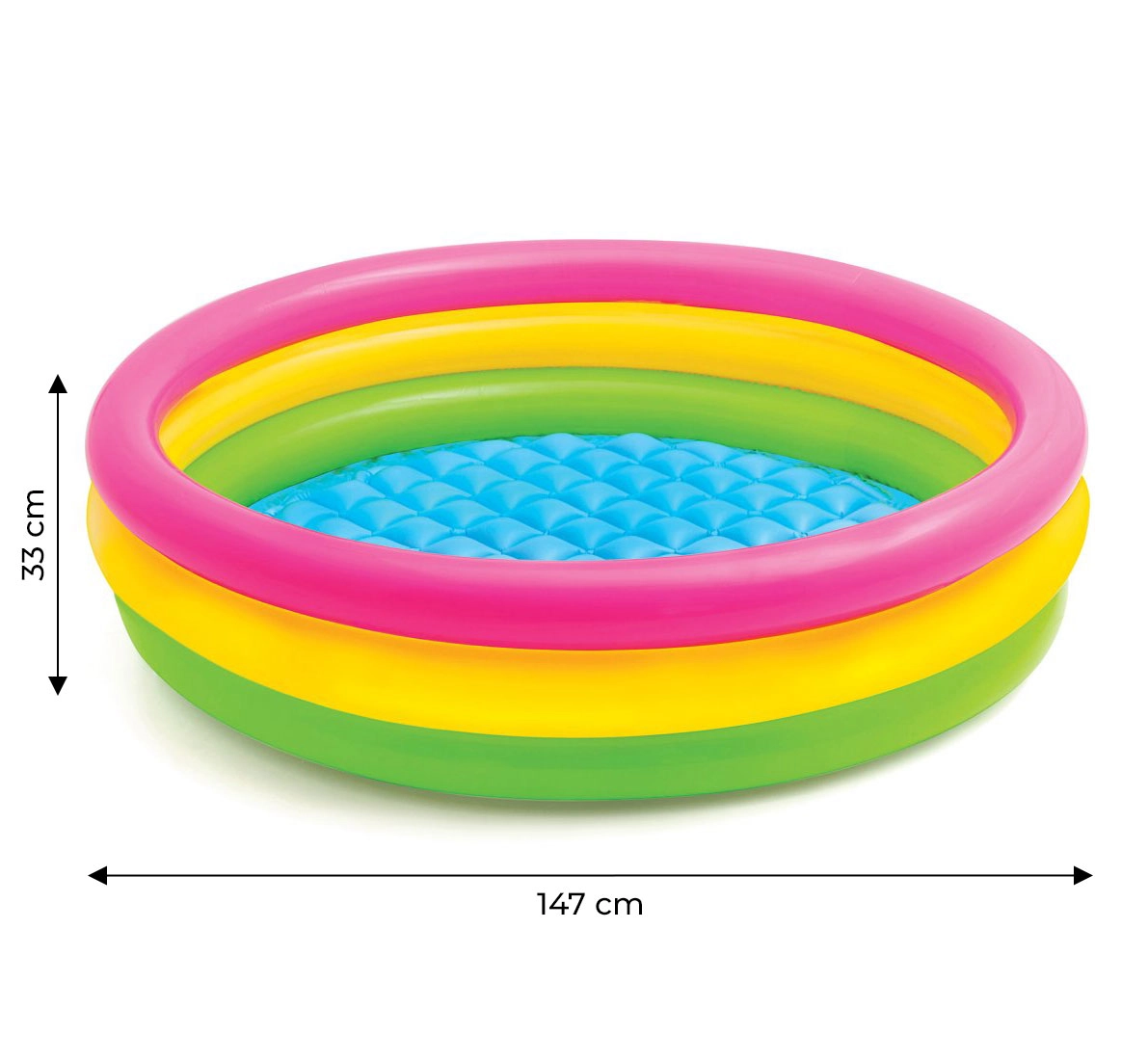 Pripučiamas vaikiškas baseinas, kurio skersmuo 147 cm ir aukštis 33 cm, yra idealus pasirinkimas karštoms vasaros dienoms. Ryškios rožinė, geltona ir žalia spalvos patiks kiekvienam vaikui ir pavers bet kurią erdvę maža vandens karalyste.