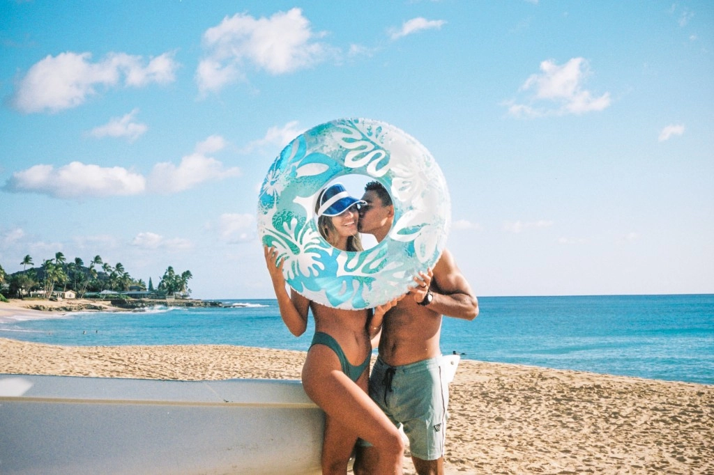 Ryškus havajinių gėlių atspaudas suteiks jūsų vasarai spalvų ir puikiai tiks tiek prie baseino, tiek paplūdimyje.