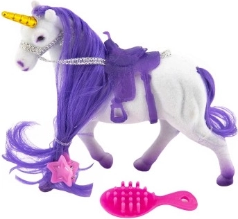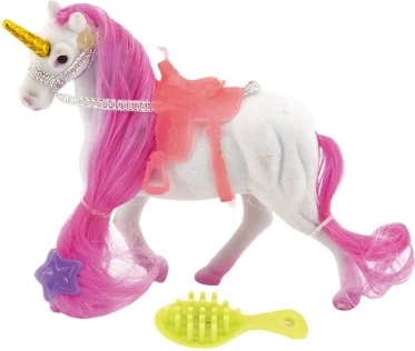 Mielas plastikinis vienaragis su švelnia aksomine danga atneša vaikams fantazijos magiją. Jis turi vešlią šukuojamą karčius ir uodegą, o balnas ir priedai suteikia dar daugiau smagaus žaidimo. Puiki dovana žirgų mylėtojams nuo 3 metų.