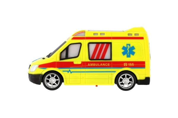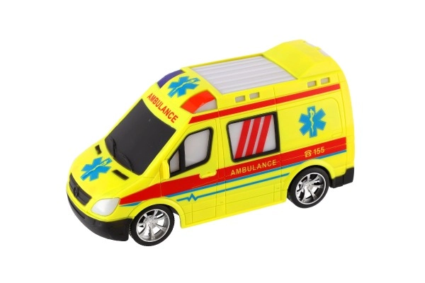 Ryškiai geltona greitoji su AMBULANCE užrašais ir veikiančia šviesa skatina kūrybišką mažųjų gelbėtojų žaidimą.