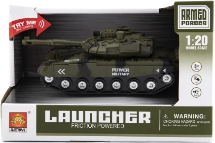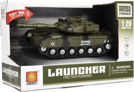 Realistiškas plastikinis tankas mažiesiems kariams pradžiugins kiekvieną karinės technikos gerbėją. Dėl inercinio mechanizmo, šviesos efektų ir garsų siūlo veiksmingą žaidimą, kupiną įspūdžių. Baterijos pridedamos, todėl pramoga gali prasidėti iš karto.