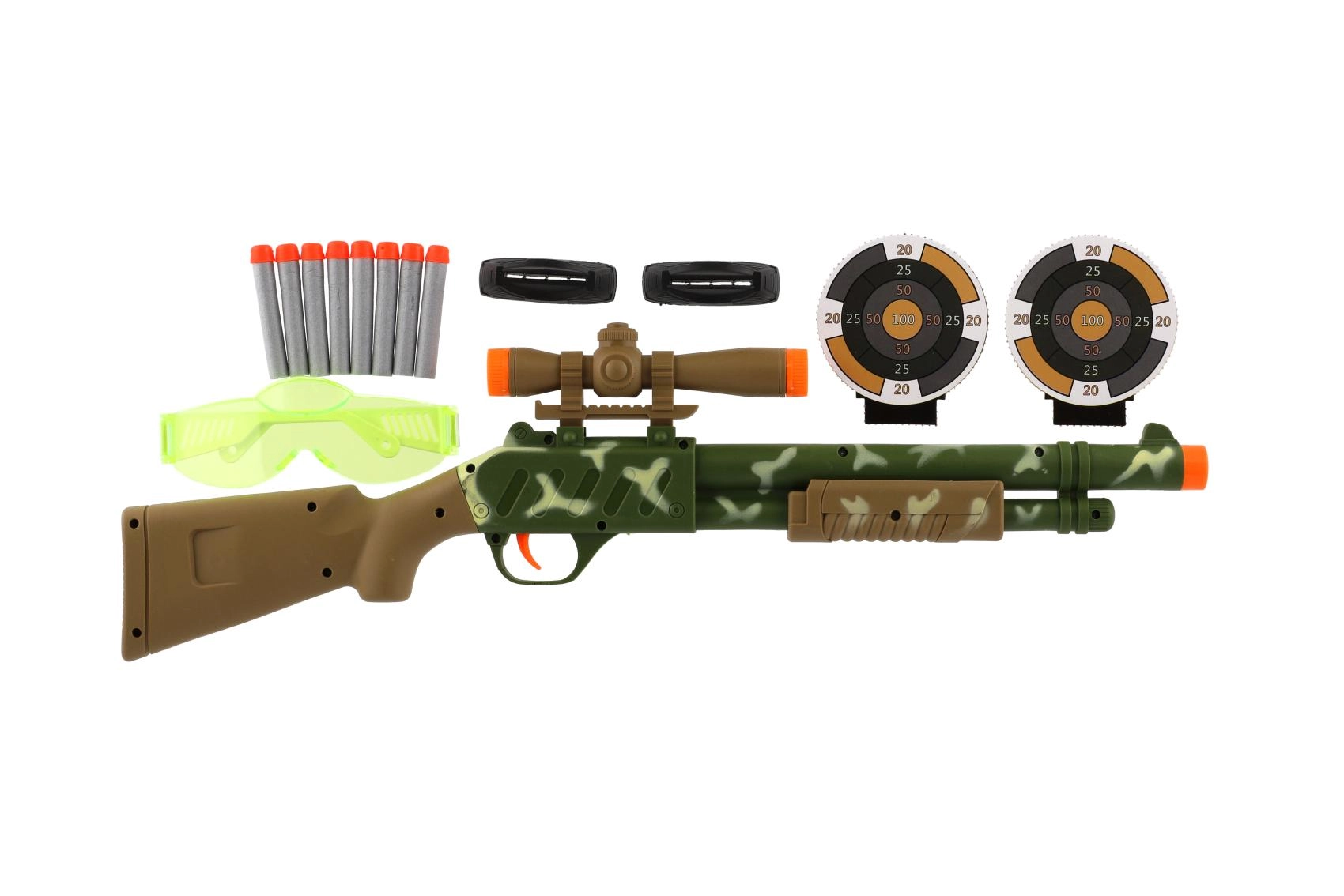 • Visas rinkinys – šautuvas, 8 šoviniai ir apsauginiai akiniai.