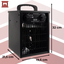 Galingas elektrinis karšto oro šildytuvas KAMINER 3000 W greitai ir saugiai sušildo patalpą iki 30 m². Siūlo tris režimus – šildymas, ventiliacija ir vėsinimas, turi savaime persikraunantį termostatą su reguliavimu 0–85 °C ir IPX4 apsaugą nuo vandens taškymosi. Stabilios neslystančios kojelės, apsauga nuo perkaitimo ir tvirtas plieninis korpusas užtikrina patikimą veikimą ištisus metus.