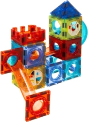 Magnetinės kaladėlės ir trasos elementai iš patvaraus ABS plastiko dėl stiprių magnetų lengvai ir stabiliai susijungia. Vaikai gali statyti plokščias ir erdvines konstrukcijas, bokštus, tiltus ir, svarbiausia, kūrybiškas rutuliukų trasas su tuneliais, posūkiais ir dubenėliais. Permatomos spalvos padeda pažinti formas ir spalvas bei skatina atradimus.