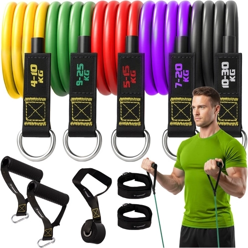 Pilnas TRIZAND pasipriešinimo gumų rinkinys efektyvioms treniruotėms namuose ir sporto salėje. Sudėtyje yra 5 juostos su 4–30 kg pasipriešinimu, rankiniai dirželiai, kulkšnių dirželiai, durų inkaras ir dėklas. Dėl atsparaus latekso, didelio elastingumo ir neslystančių rankenėlių saugiai treniruosite visą kūną – nugarą, rankas, kojas, pilvą ir sėdmenis.