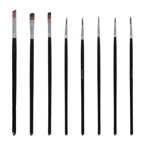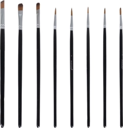 Rinkinyje 10 teptukų (plokšti ir apvalūs) ir lengva plastikinė paletė su įdubomis bei skylute nykščiui patogiam maišymui ir detalėms.