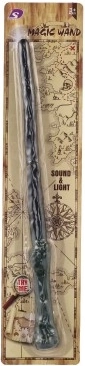 Magiška lazdelė mažiesiems burtininkams su šviesos ir garso efektais. Puikus kostiumo aksesuaras, ilgis 36 cm, patvarus plastikas. Į komplektą įeina 3× AG13 baterijos, tinka nuo 3 metų.