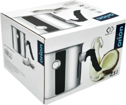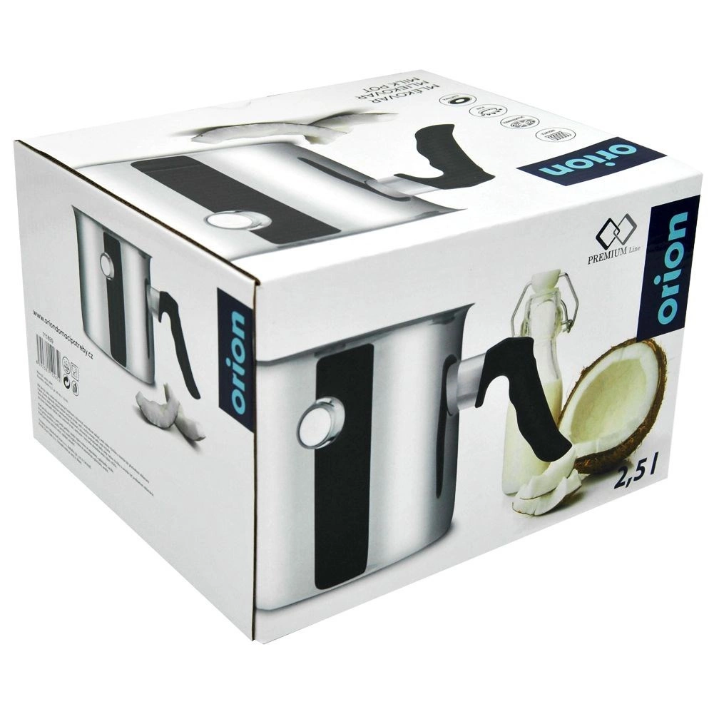 Praktiškas nerūdijančio plieno pieno puodas, 2,5 l talpos, su vandens apvalkalu ir švilpuku dangtelyje apsaugo nuo pieno ar padažų pridegimo. Tinka visų tipų viryklėms, įskaitant indukcines, turi ergonomišką karščiui atsparią rankeną ir lengvai valomas, taip pat tinka plauti indaplovėje.
