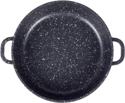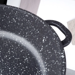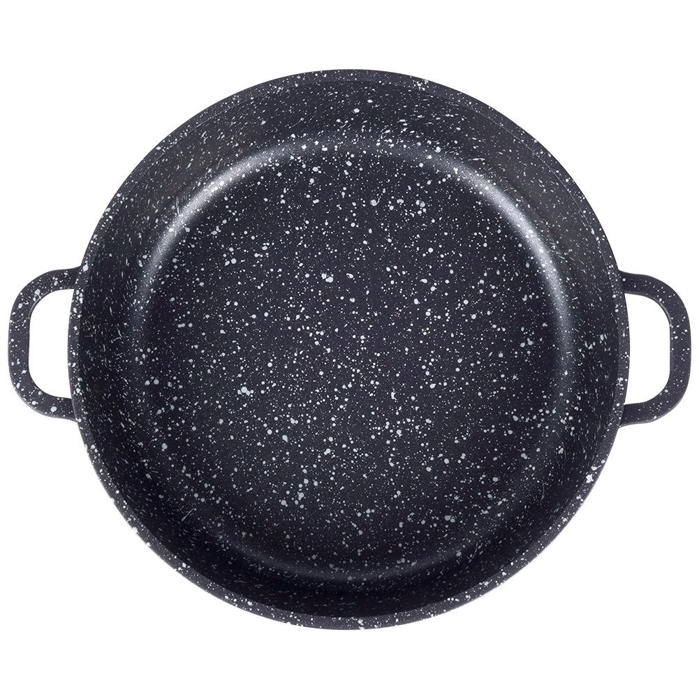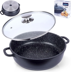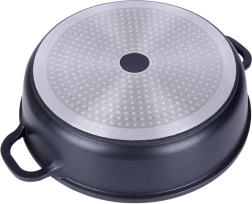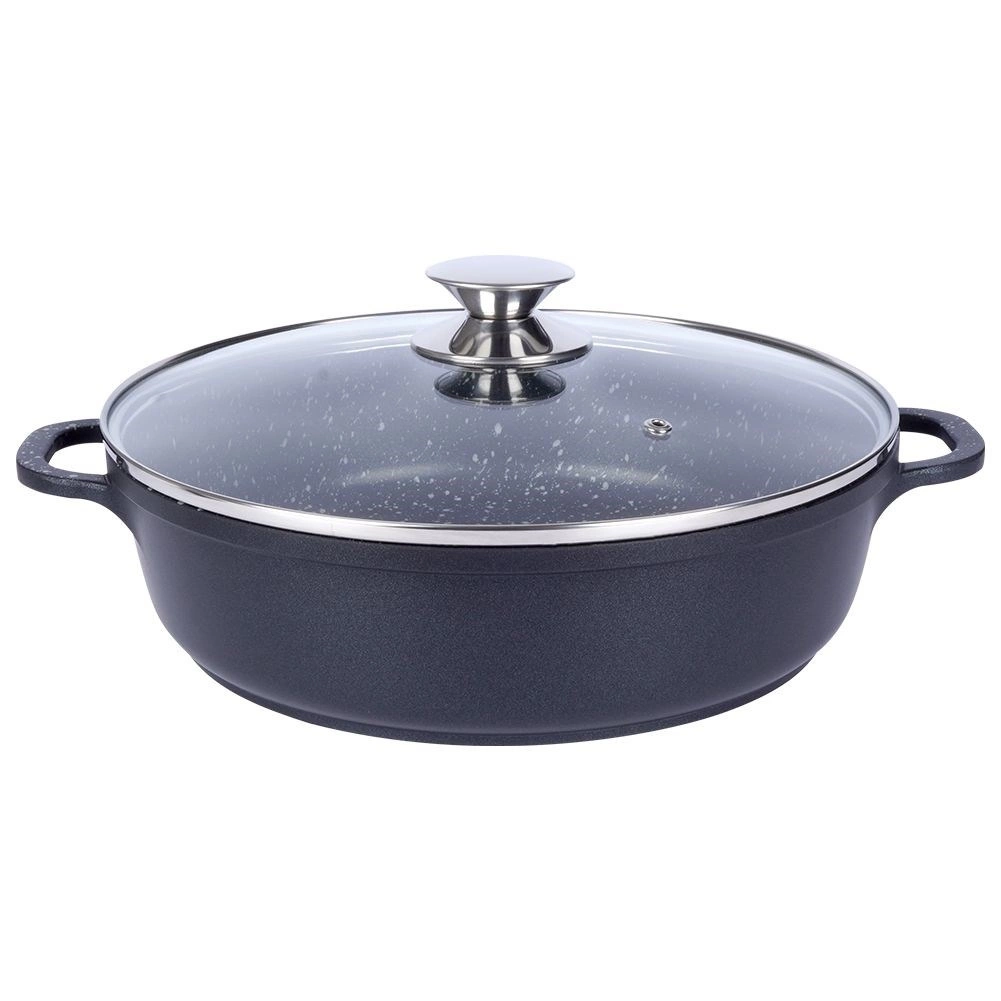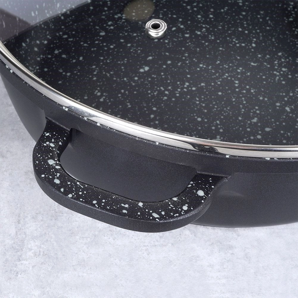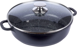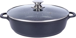 Tvirta aliumininė keptuvė elegantiškos juodos spalvos, su akmens masės išvaizda, viduje turi aukštos kokybės granito nelipnią PFLUON dangą, atsparią aukštai temperatūrai ir įbrėžimams. Stiklinis dangtis su nerūdijančio plieno apvadu ir garų vožtuvu palengvina gaminamo maisto kontrolę ir išlaiko drėgmę sultingiems rezultatams.