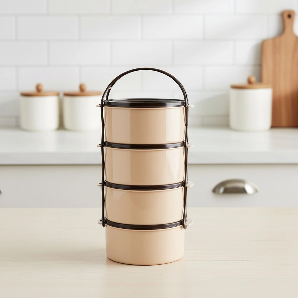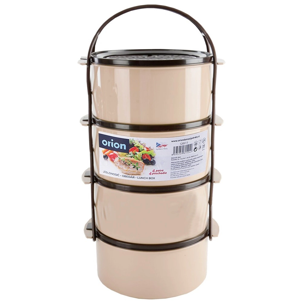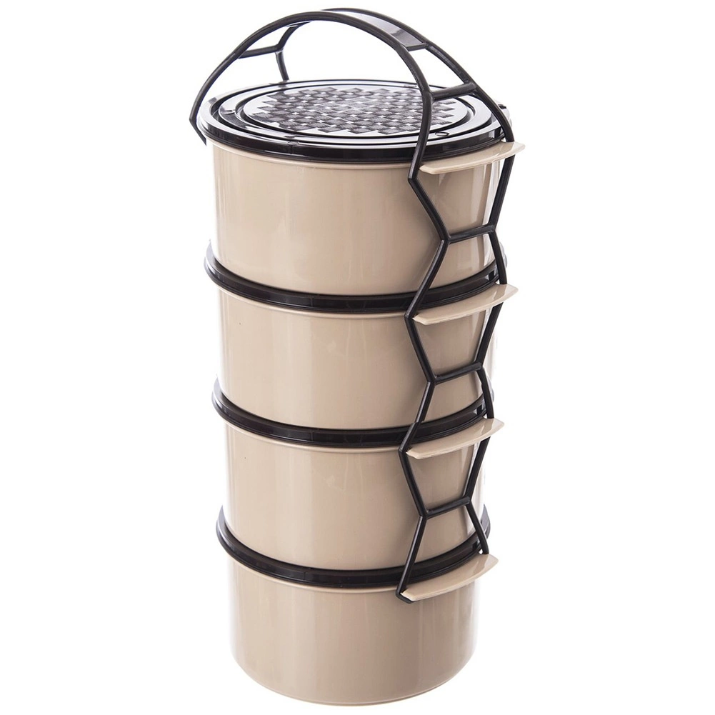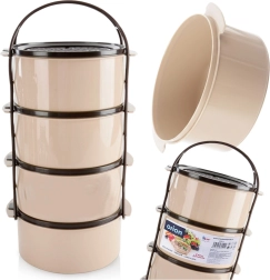 Praktiška keturių aukštų maisto dėžė, kurios talpa 4×1,5 l, patogiam patiekalų atskyrimui. Turi sustatomas talpas su dangteliais, tvirtą laikančią konstrukciją su rankena ir patvarų, smėlio–rudos spalvos dizainą. Tinka indaplovei, šaldytuvui, šaldikliui ir mikrobangų krosnelei be dangtelių.