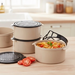 Didelė talpa pagrindiniam patiekalui, garnyrams ir desertui. Kiekvienas indas turi atskirą dangtelį, todėl maistą laikysite atskirai ir tvarkingai.