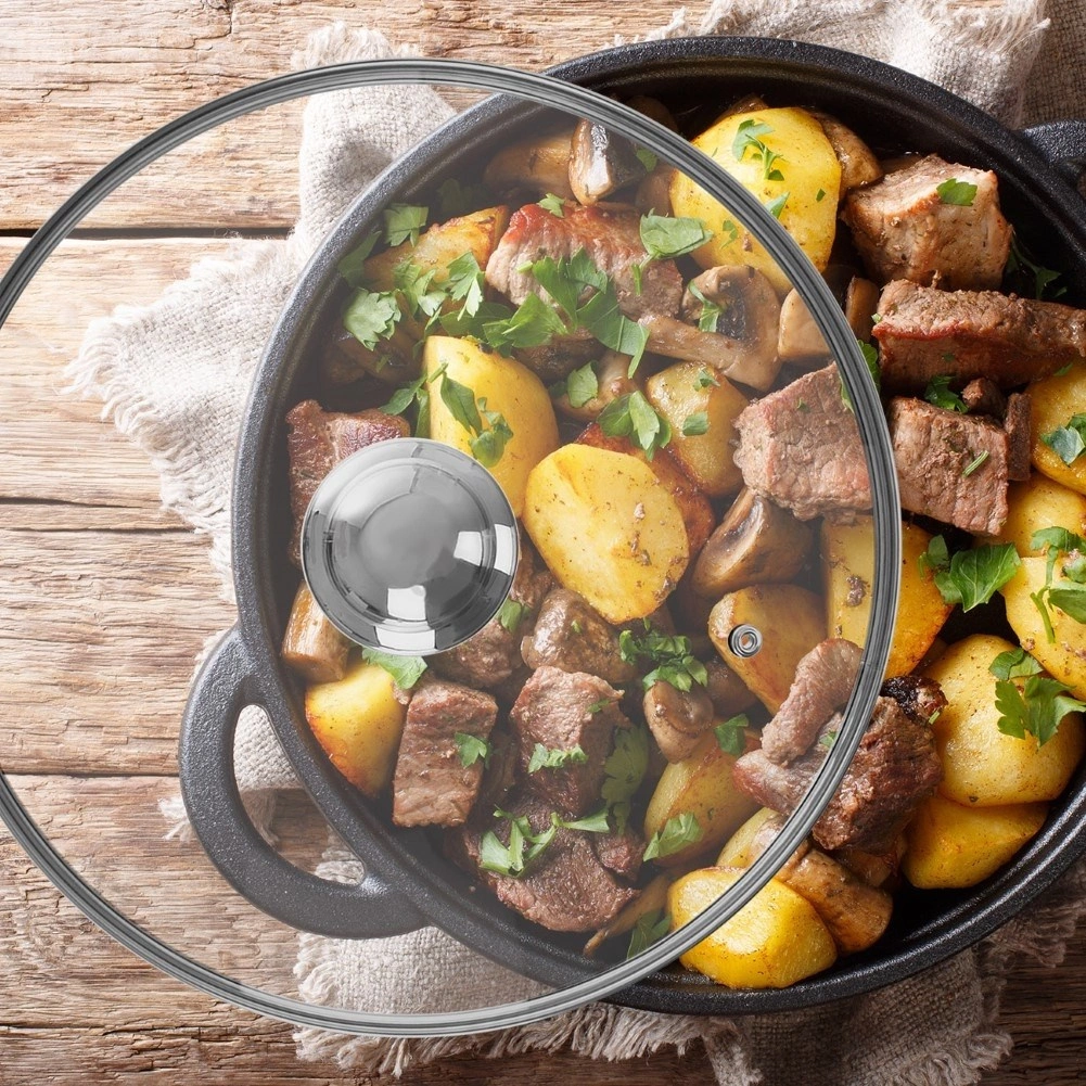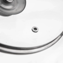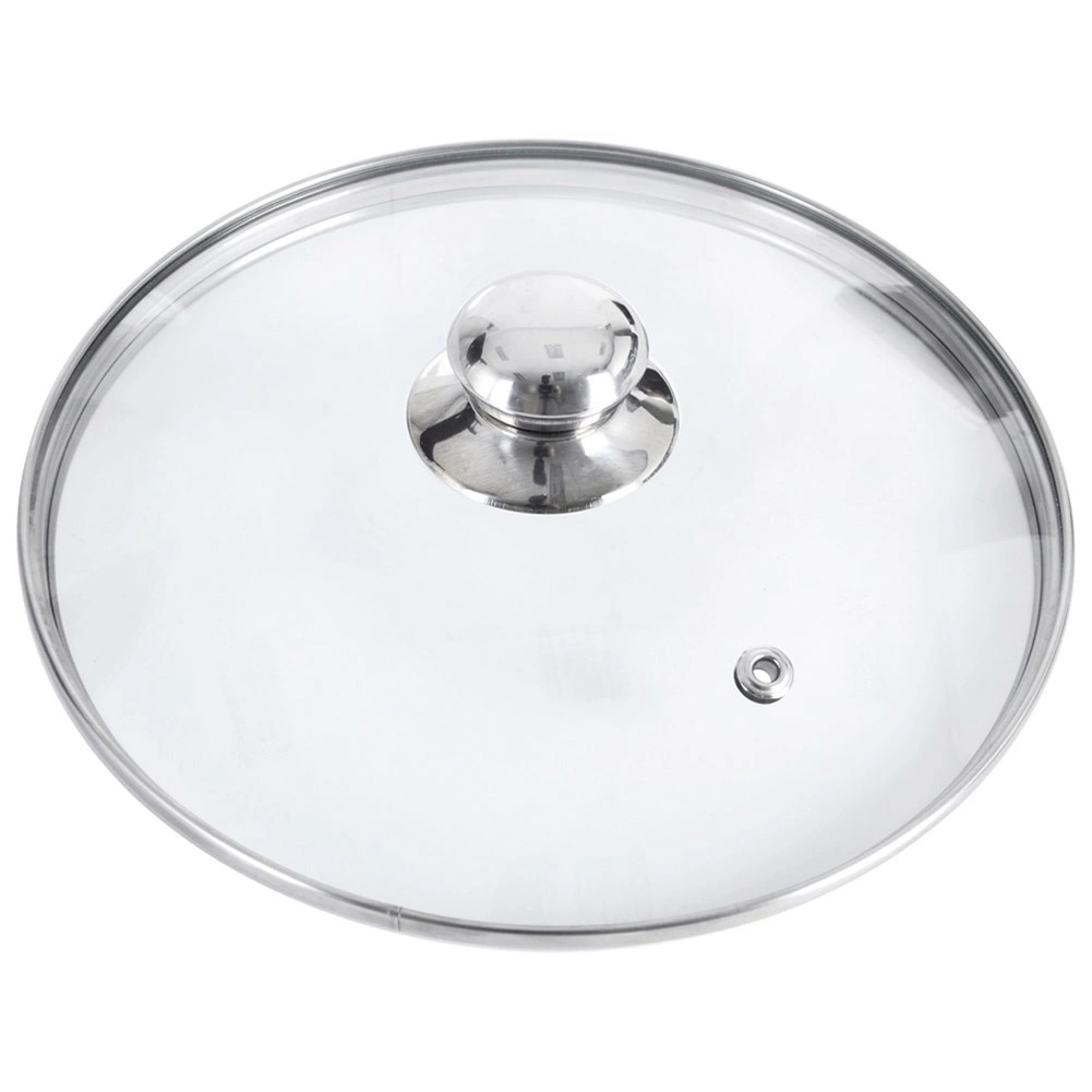 Universalaus 30 cm skersmens stiklinis dangtis su nerūdijančio plieno krašteliu ir patogia rankenėle. Tinka puodams, keptuvėms ir troškintuvams, turi praktišką garų vožtuvą ir yra atsparus karščiui iki 200 °C. Dėl skaidraus stiklo lengvai stebėsite virimą nekeldami dangčio, o nerūdijančio plieno apvadas užtikrina tvirtą ir sandarų prigludimą.